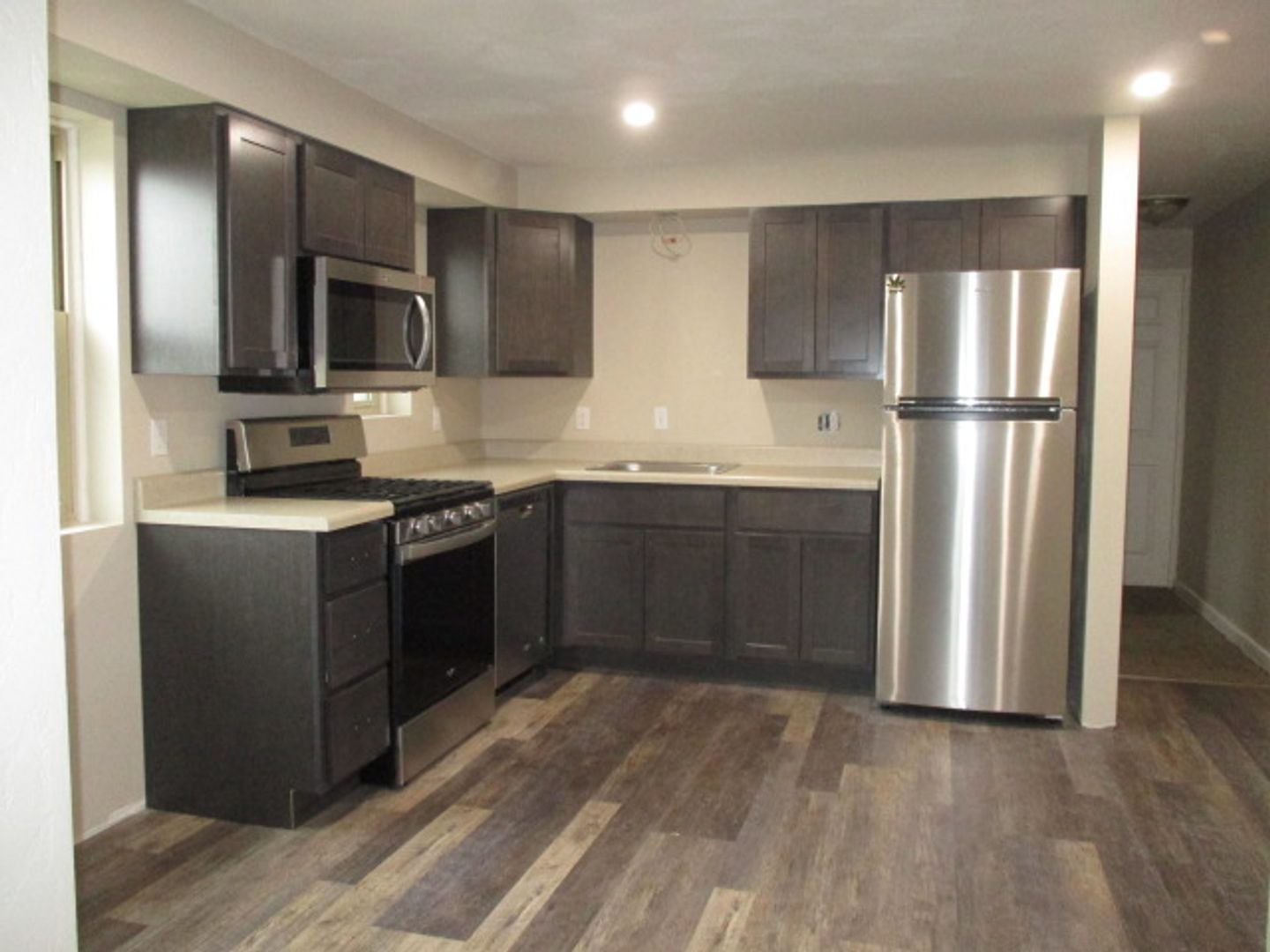 - Modern kitchen with mocha cabinets, and stainless steel appliances including refrigerator, stove, microwave and dishwasher.