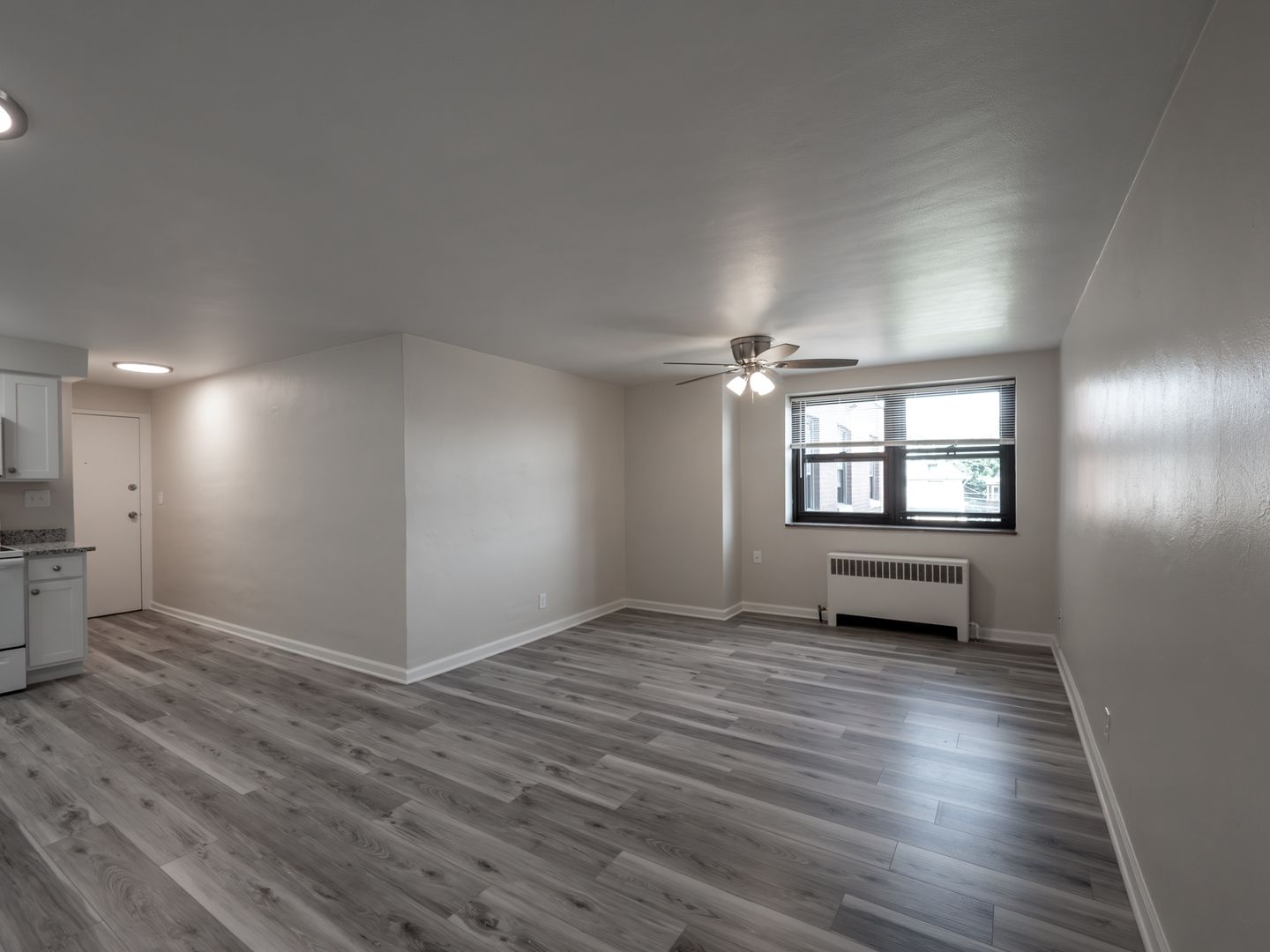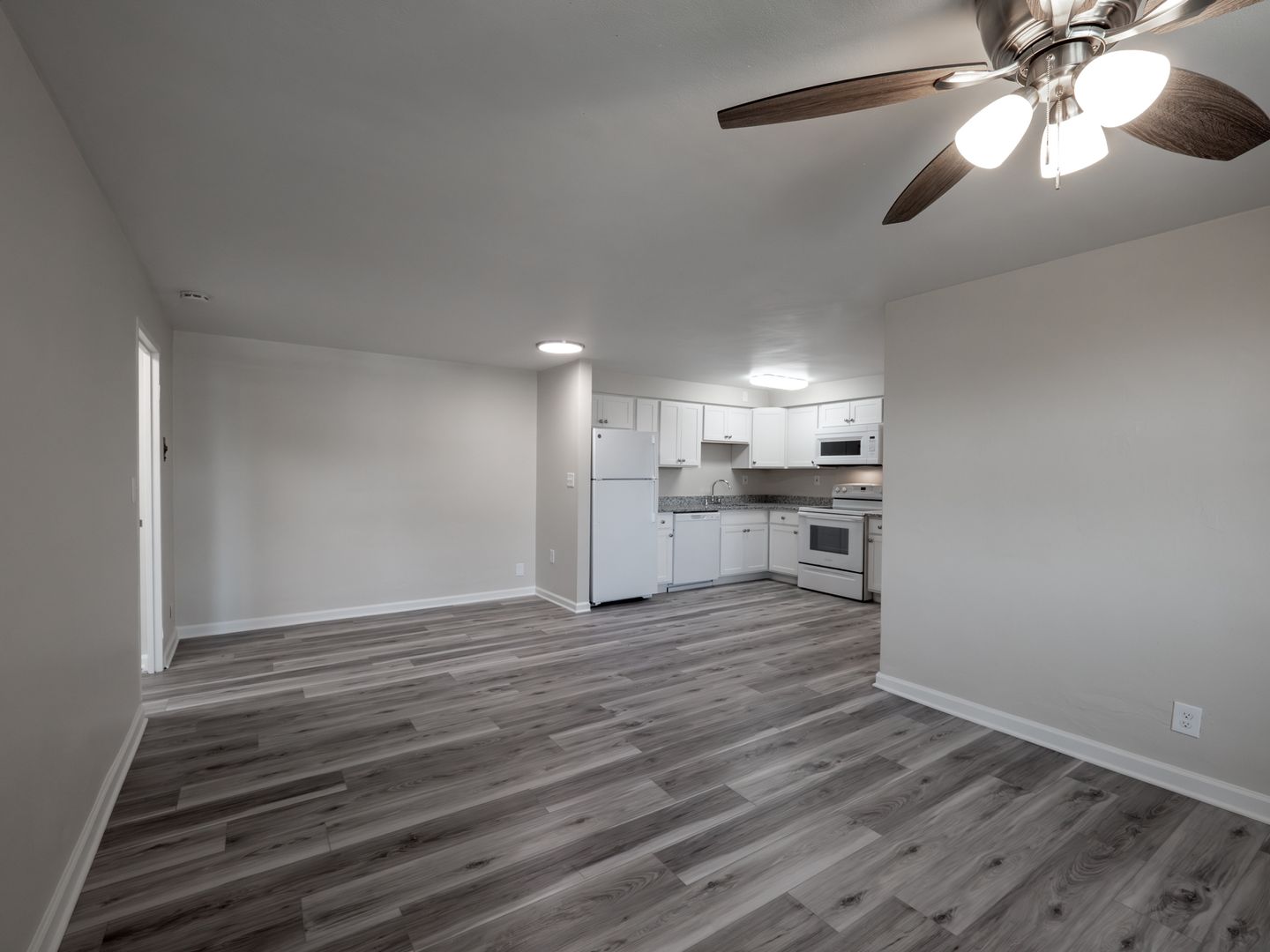 * Vinyl flooring in living room, kitchen, and bathroom