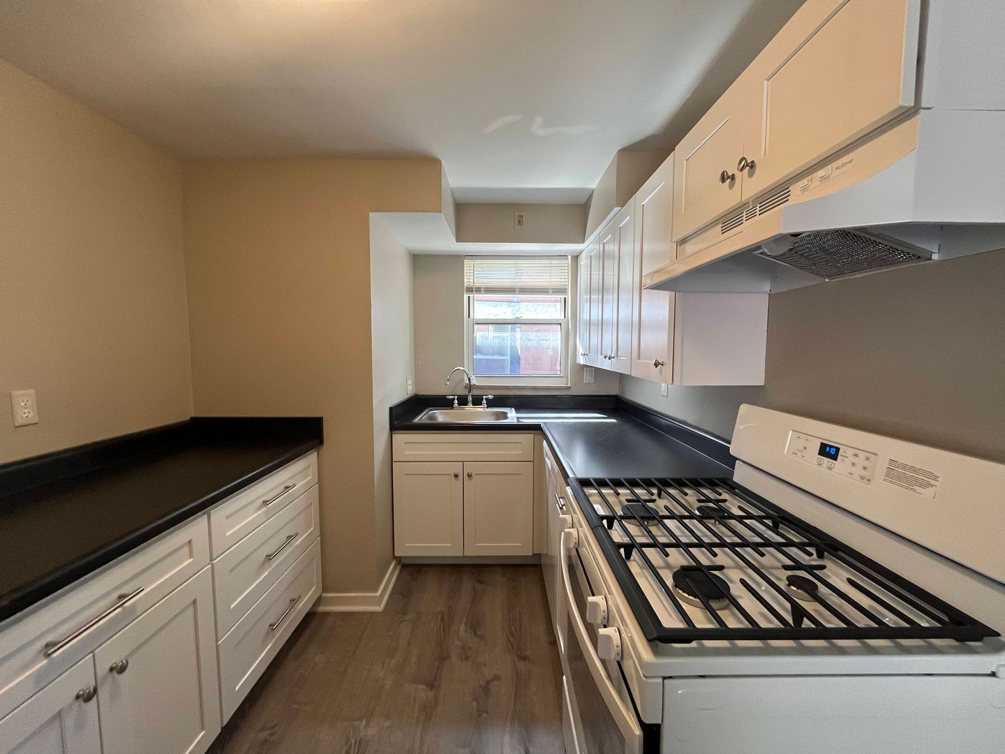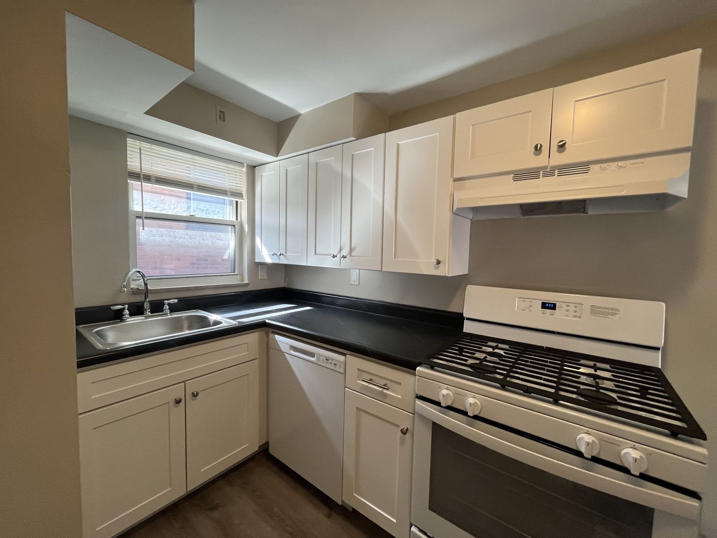 * Updated kitchen with new white cabinets, black countertops & white stove, dishwasher, and refrigerator!