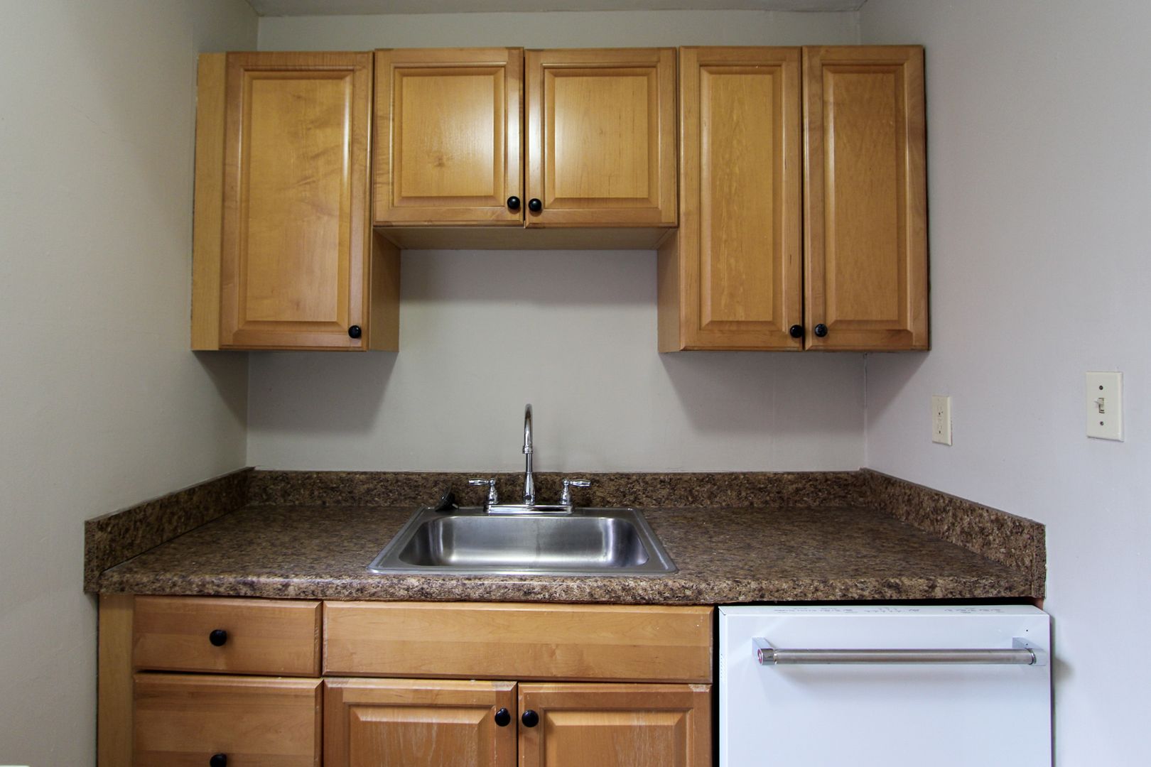 The updated kitchen includes maple cabinetry, Formica countertops, a dishwasher, and a built-in microwave!