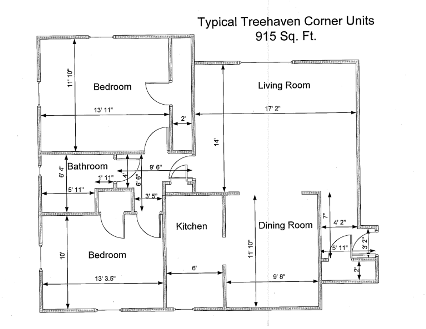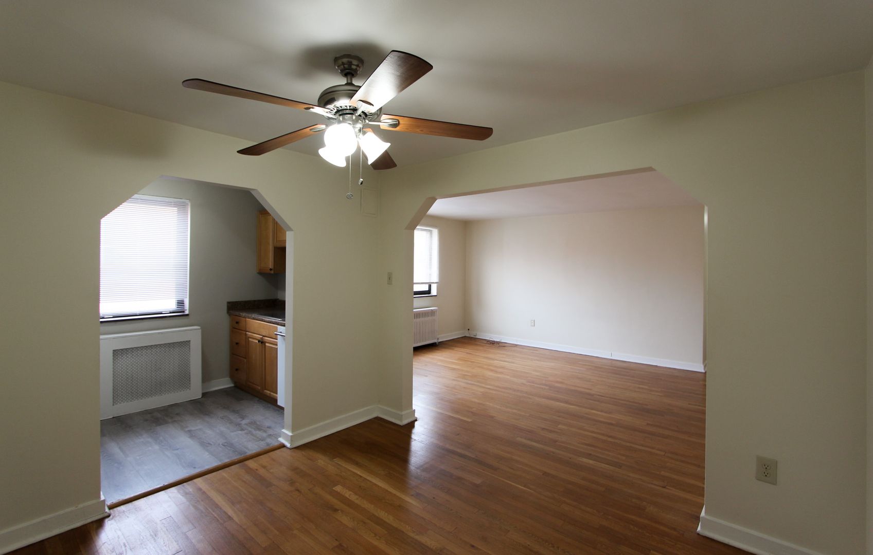 Both bedrooms are full size, and the unit features hardwood floors throughout the living room, dining room, and entryway, with comfortable wall-to-wall carpeting in the bedrooms. The open layout and corner positioning provide excellent natural light and a comfortable living flow.