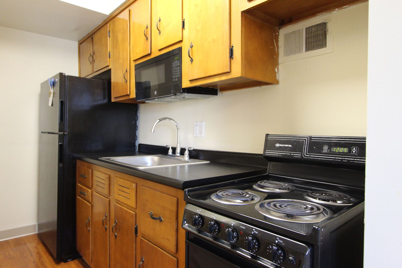 • Galley-style kitchen features refrigerator, built-in microwave, and stove