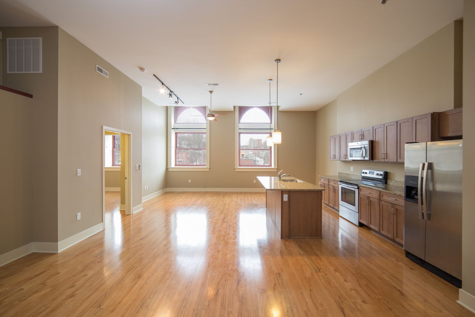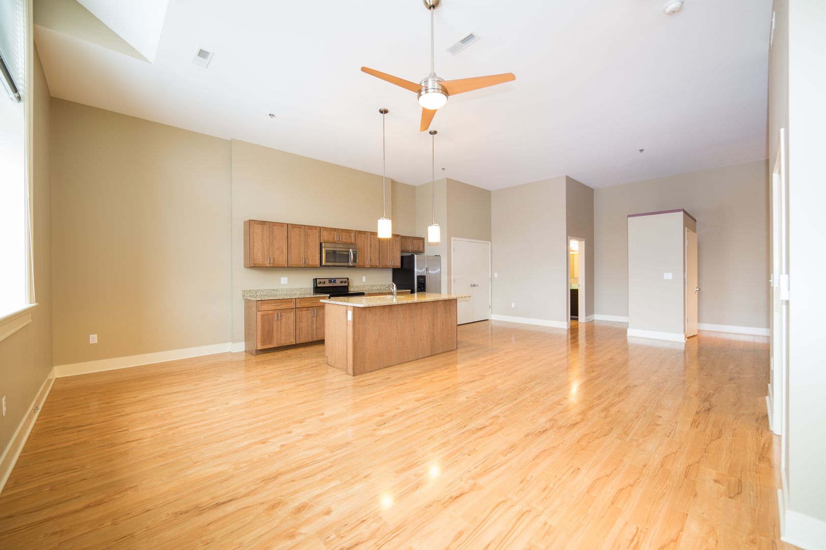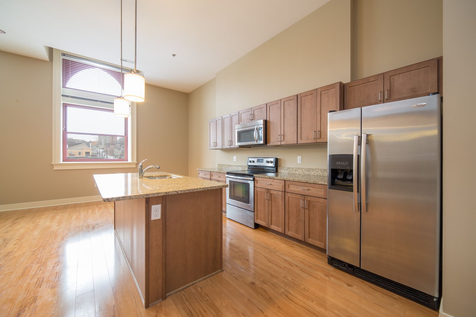 Inside, the apartment combines loft character with updated finishes throughout. Rich laminate flooring runs through the main living space, complemented by oversized windows, high ceilings, designer lighting, and window treatments that create an open, airy feel. The contemporary kitchen features granite countertops, soft-close maple cabinetry, stainless steel appliances, a built-in microwave, dishwasher, and a large island ideal for cooking and entertaining.
