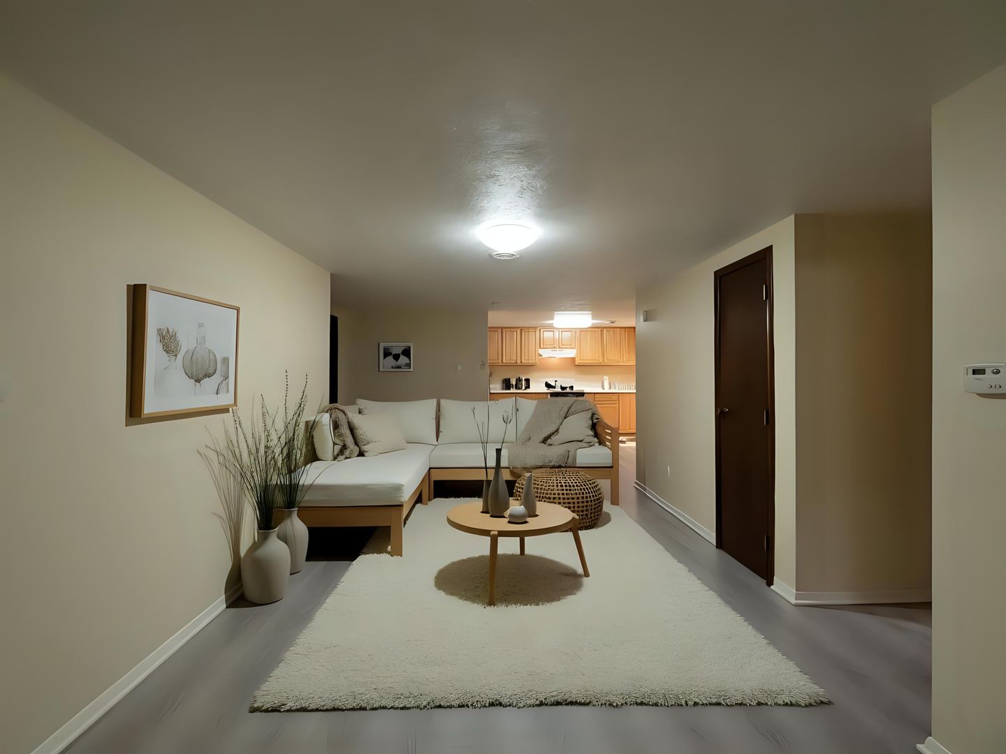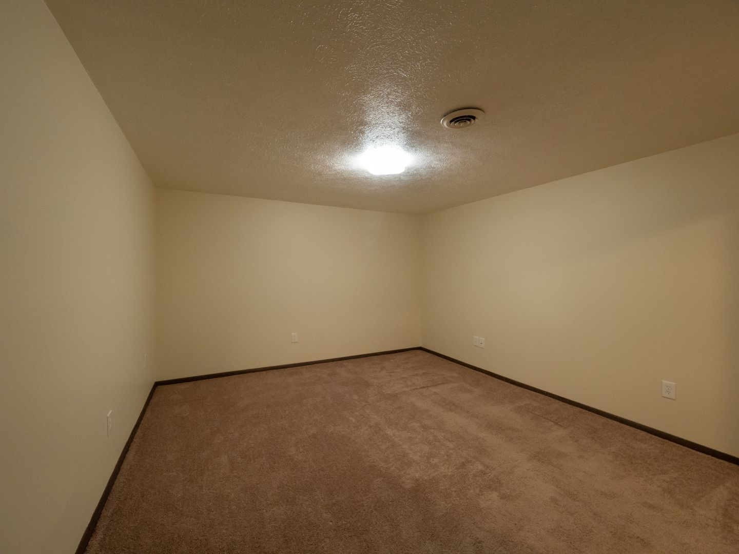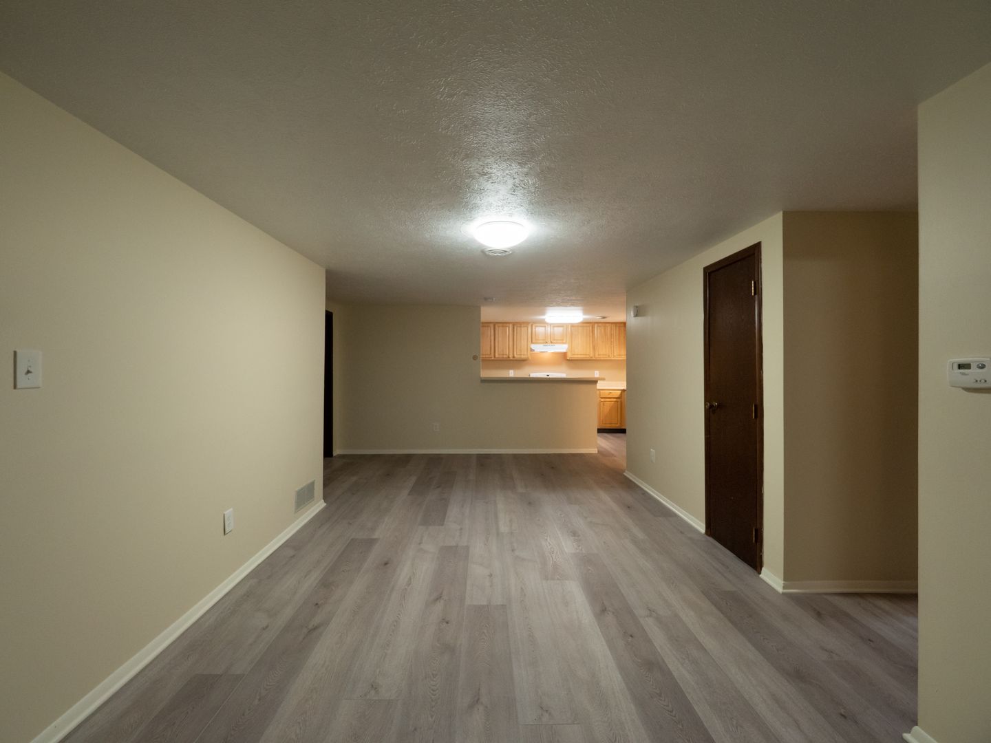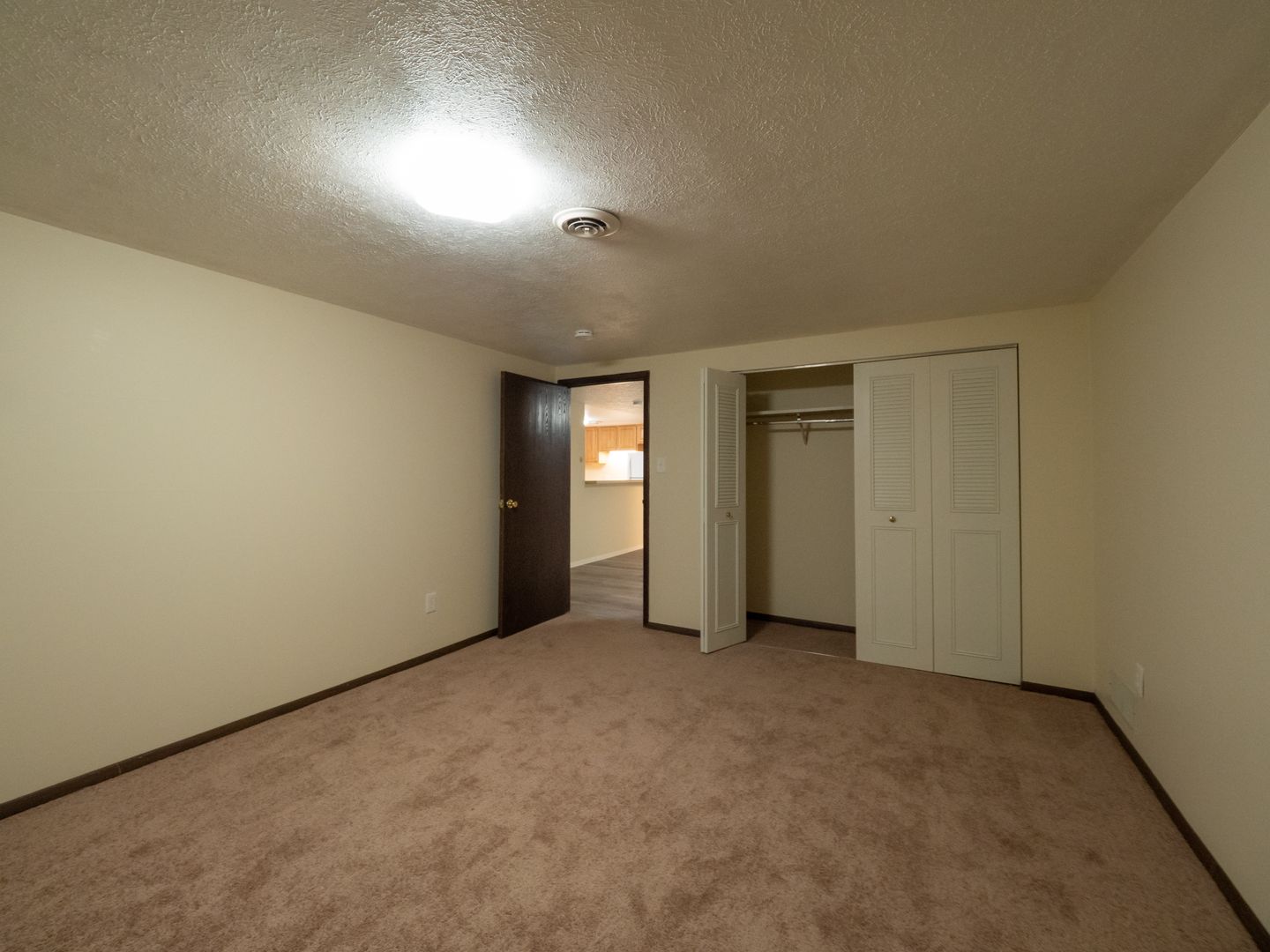 - Wall-to-wall carpeting in each bedroom. Laminate flooring in the living room/dining room area.