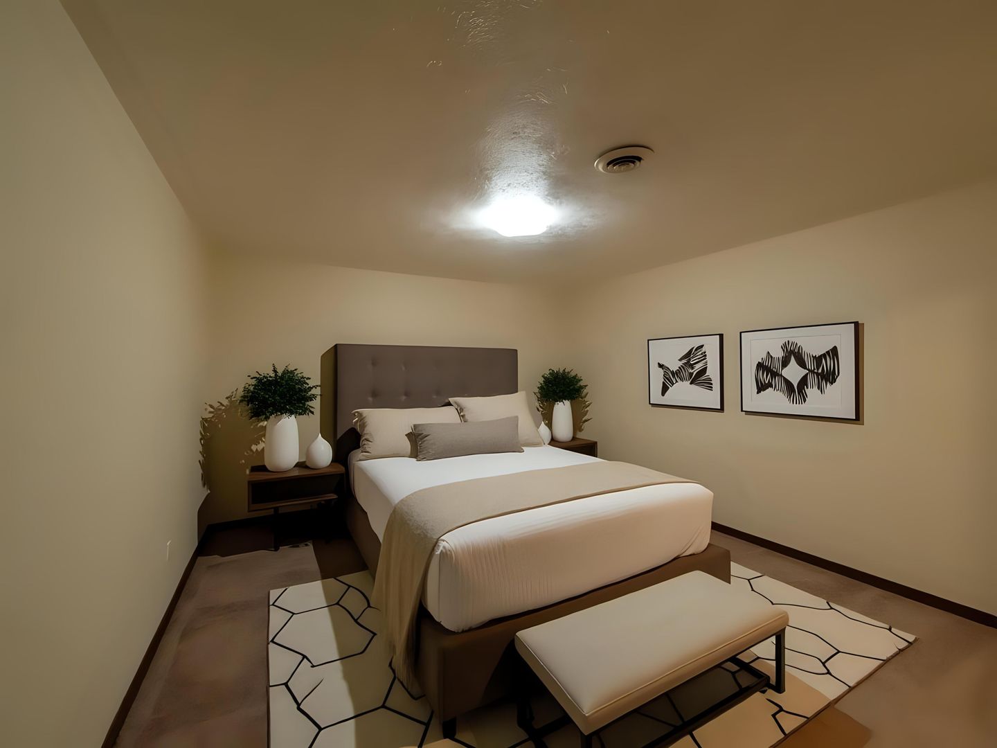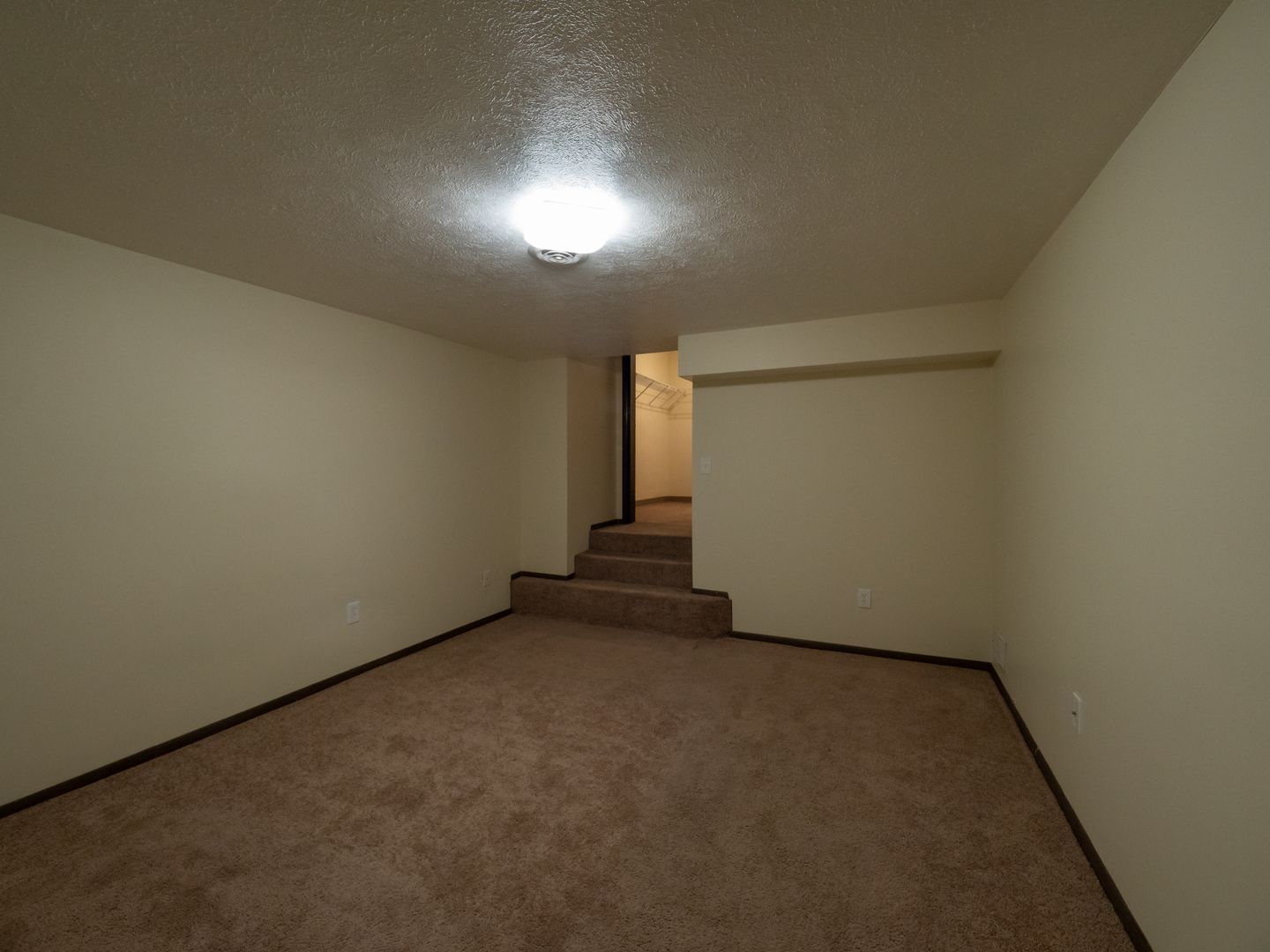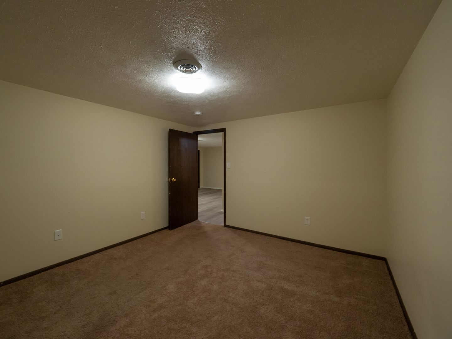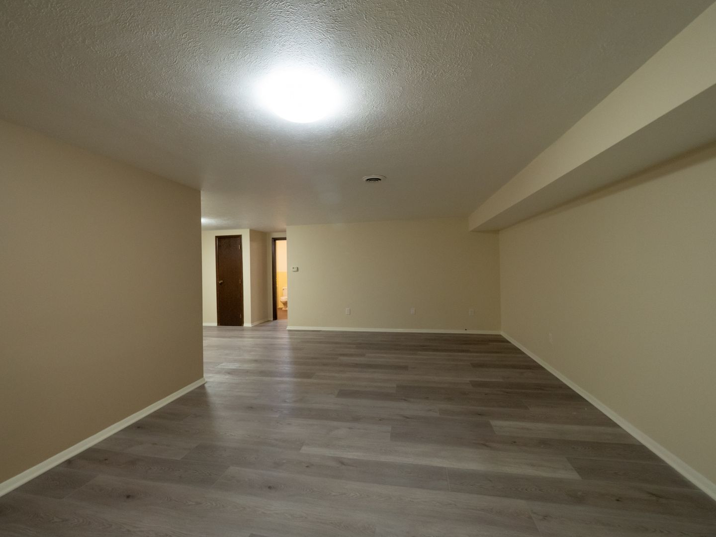 - Wall-to-wall carpeting in each bedroom. Laminate flooring in the living room/dining room area.