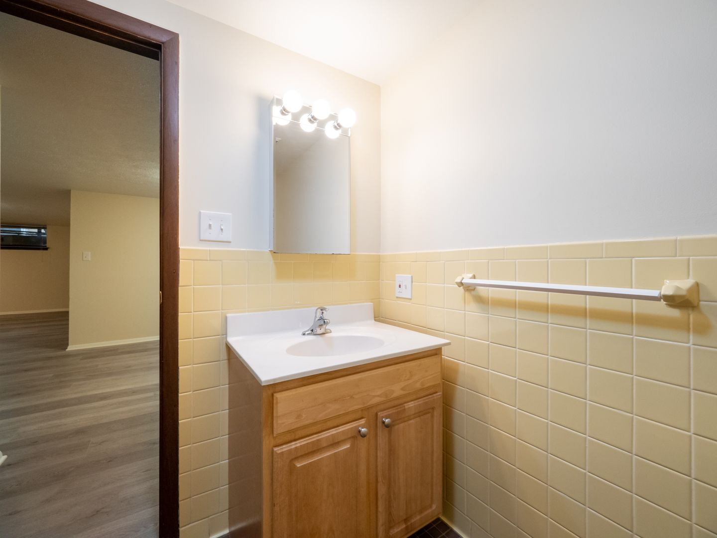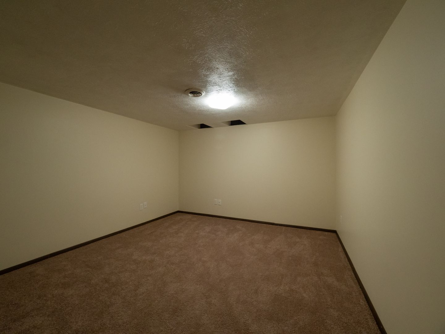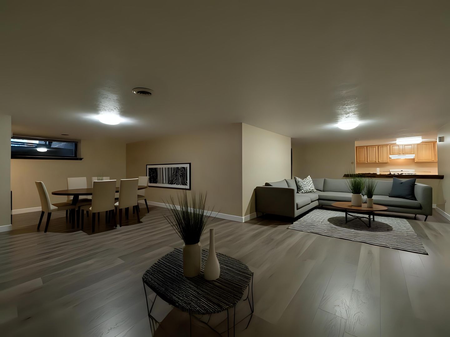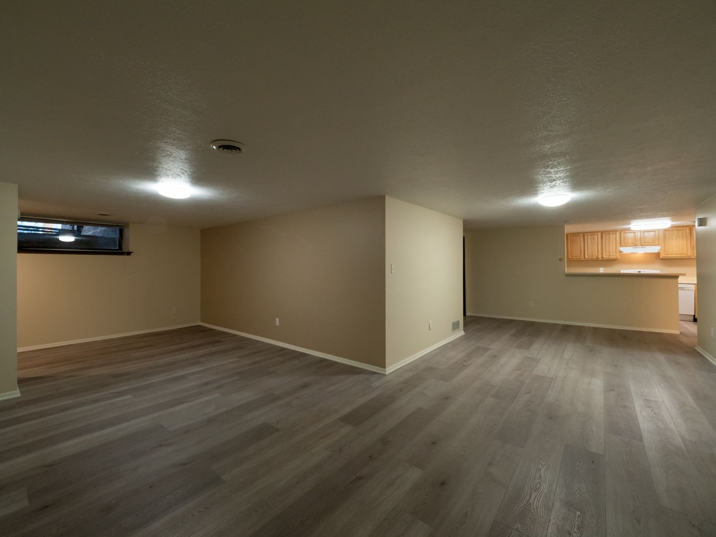 - Wall-to-wall carpeting in each bedroom. Laminate flooring in the living room/dining room area.