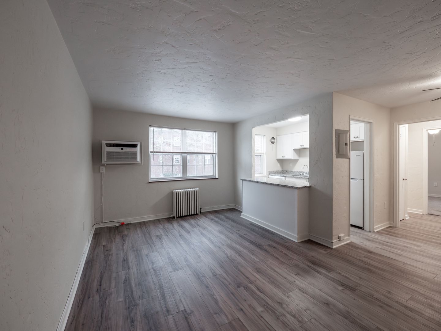 - In-wall air conditioning in living room; Ceiling fans in living room and bedroom.