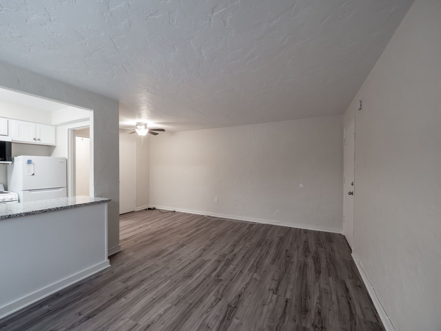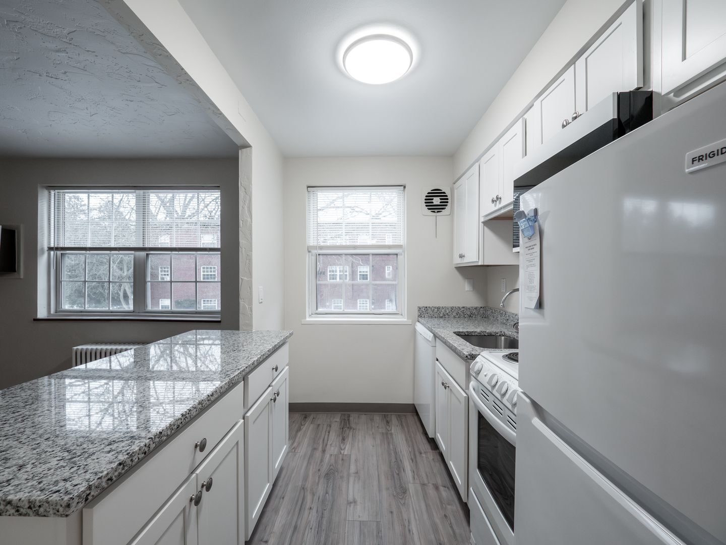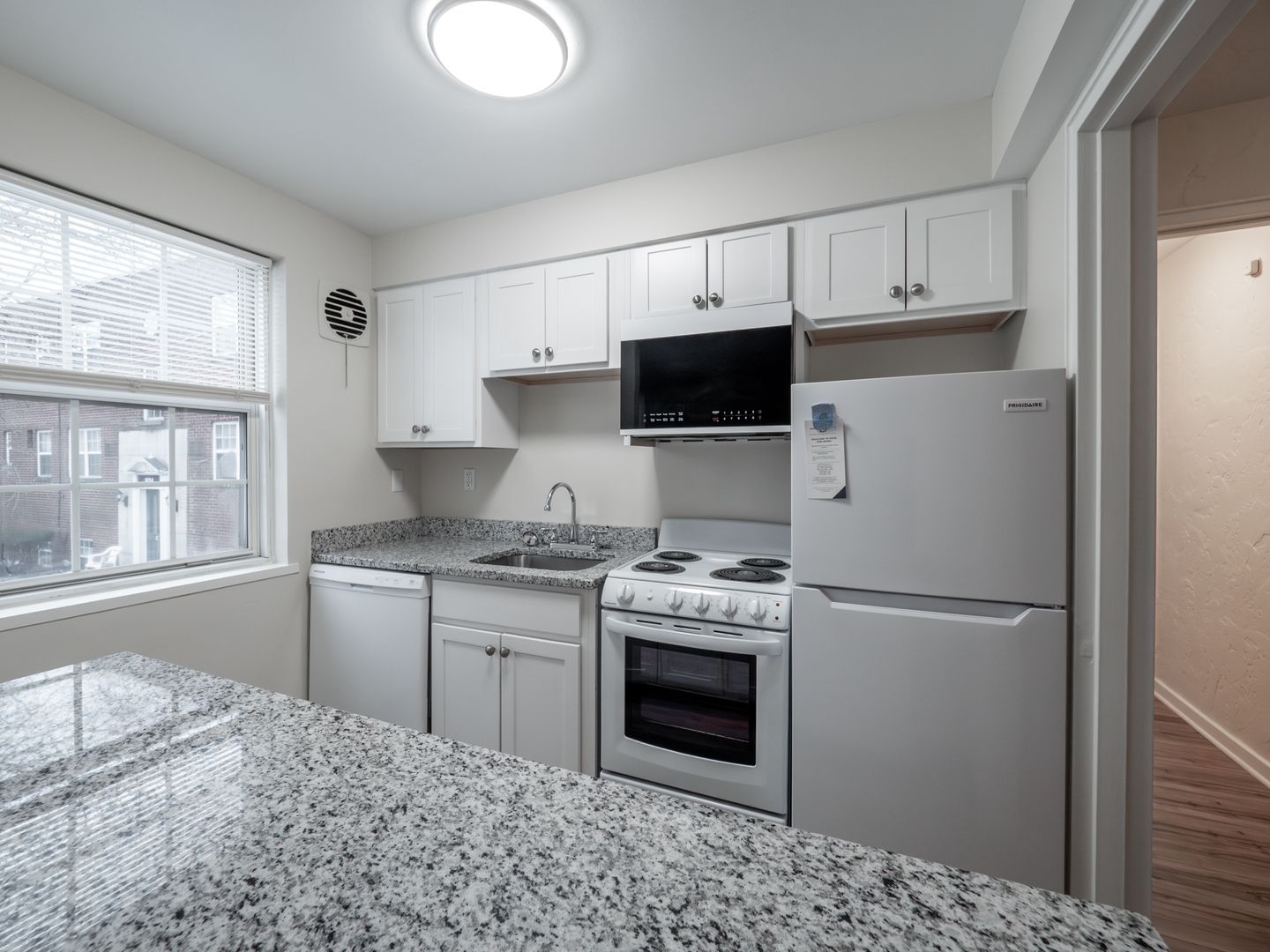 - Recently updated kitchen with white cabinets, granite countertops, and white appliances, including dishwasher and microwave!