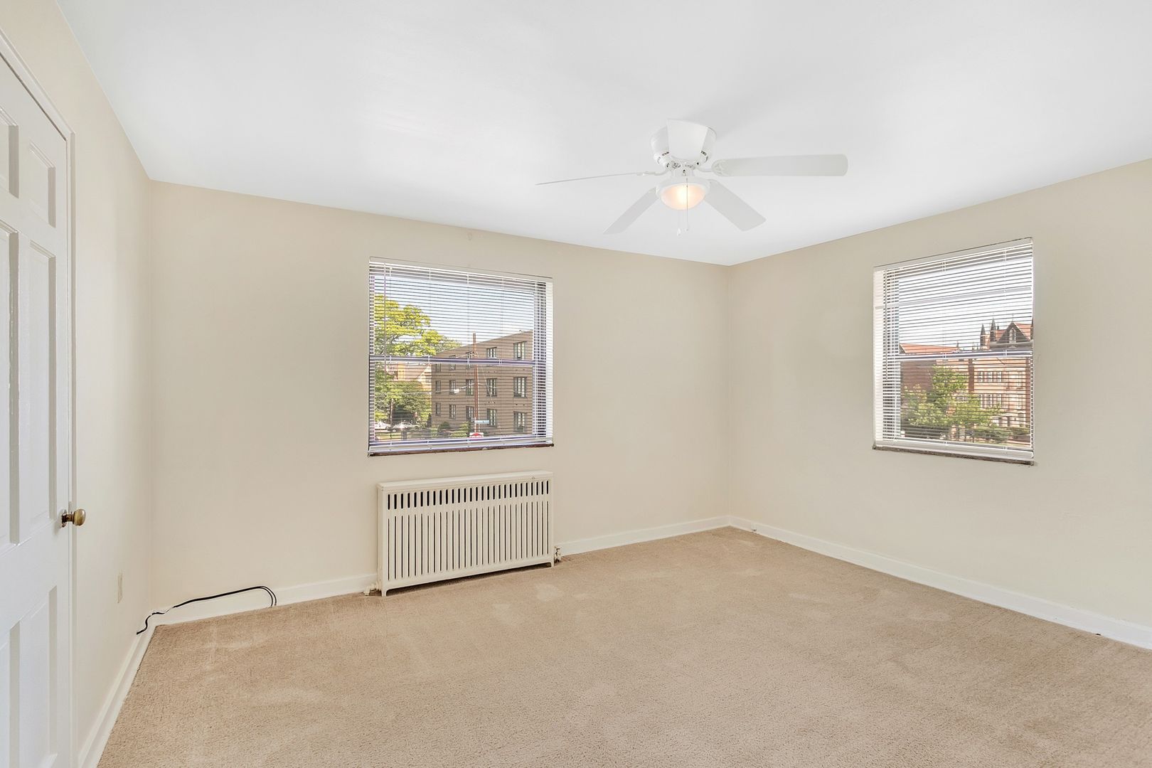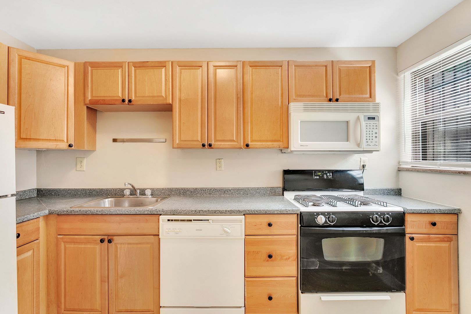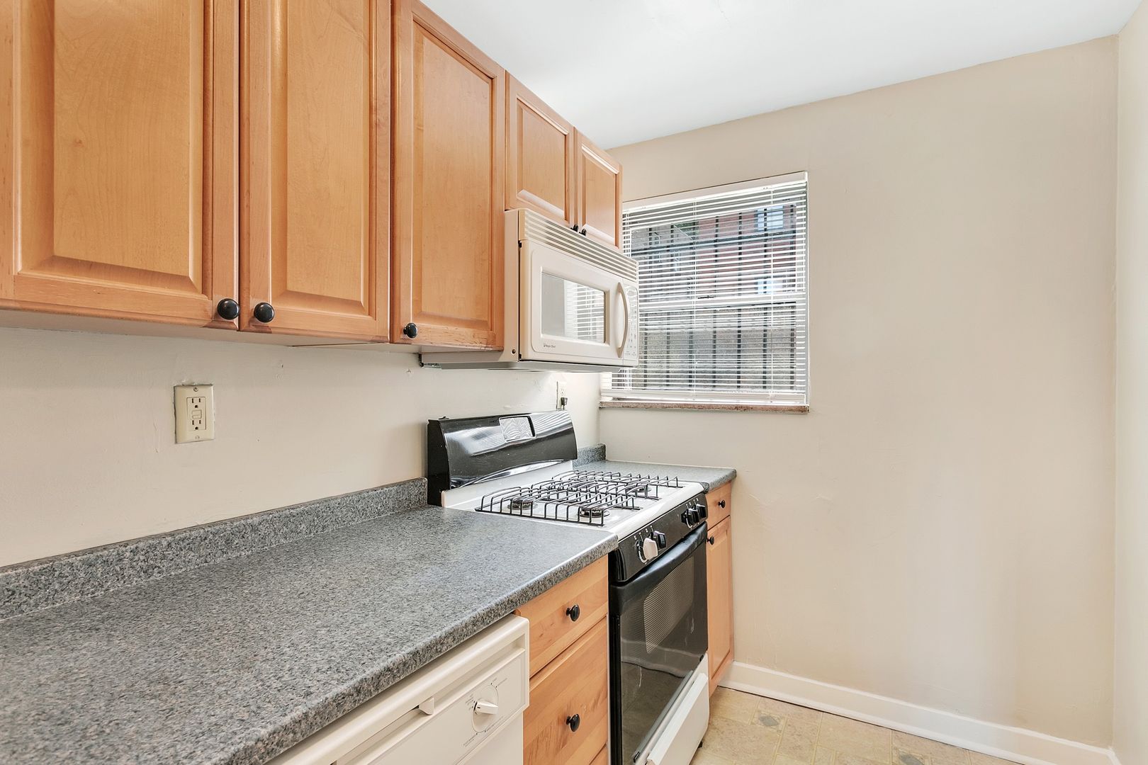 Inside, the approximately 900-square-foot layout features hardwood flooring through the living room, dining room, and entryway, while both full-size bedrooms offer wall-to-wall carpeting for added comfort. The updated L-shaped kitchen includes maple cabinetry, Formica countertops, white appliances, a dishwasher, and built-in microwave, creating an efficient workspace with strong storage and functionality. Large windows throughout the unit provide excellent sunlight, especially in the main living spaces.
