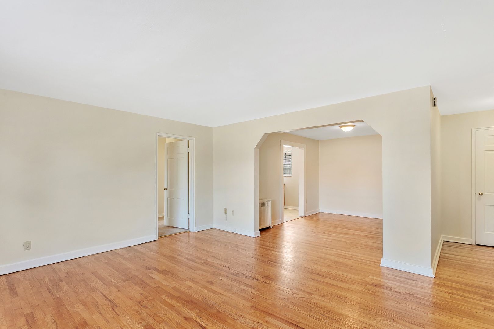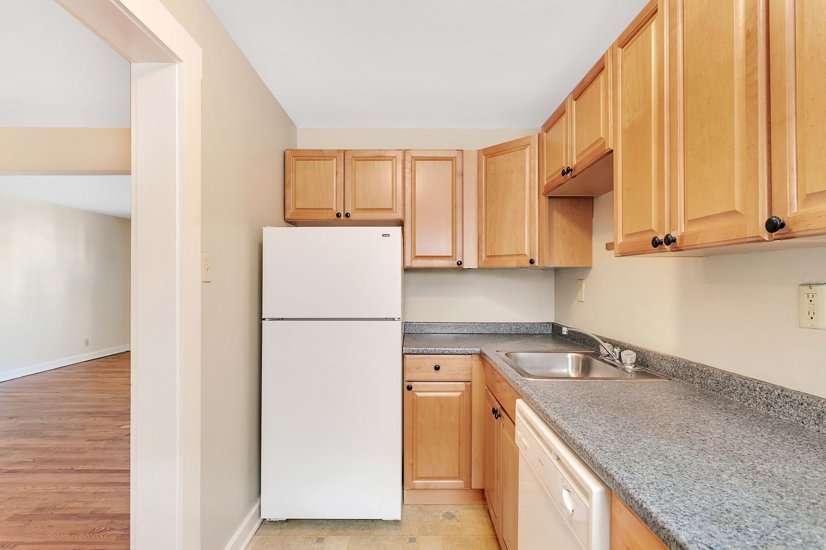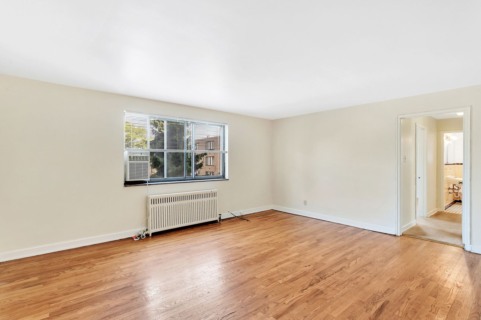 Inside, the approximately 900-square-foot layout features hardwood flooring through the living room, dining room, and entryway, while both full-size bedrooms offer wall-to-wall carpeting for added comfort. The updated L-shaped kitchen includes maple cabinetry, Formica countertops, white appliances, a dishwasher, and built-in microwave, creating an efficient workspace with strong storage and functionality. Large windows throughout the unit provide excellent sunlight, especially in the main living spaces.