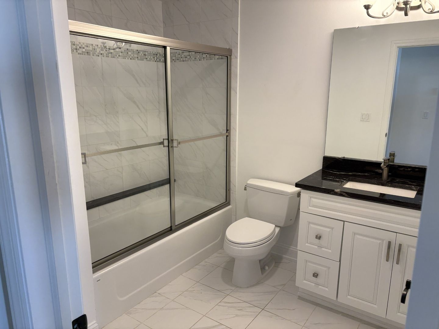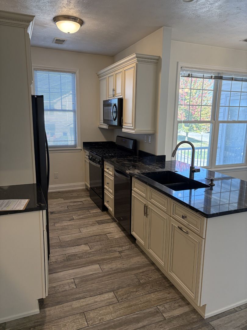 -Sleek kitchen with granite counters, dishwasher, and microwave.
