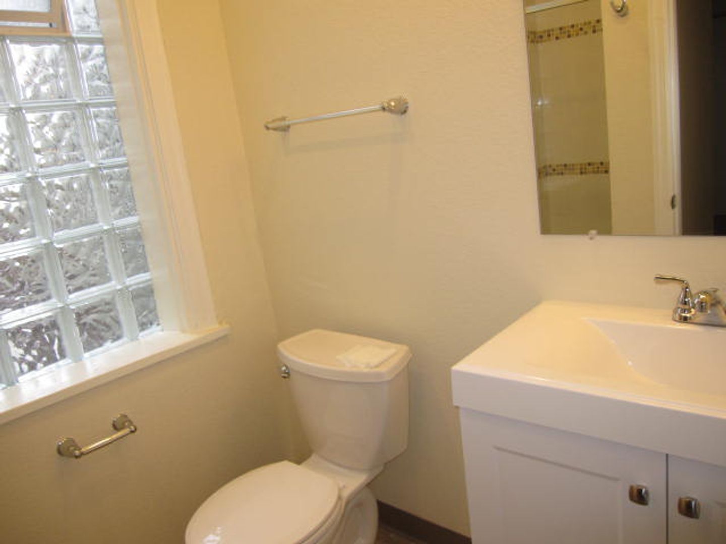 - Bright Bathroom with unique Mosaic Glass Tile! Glass-door standing shower.