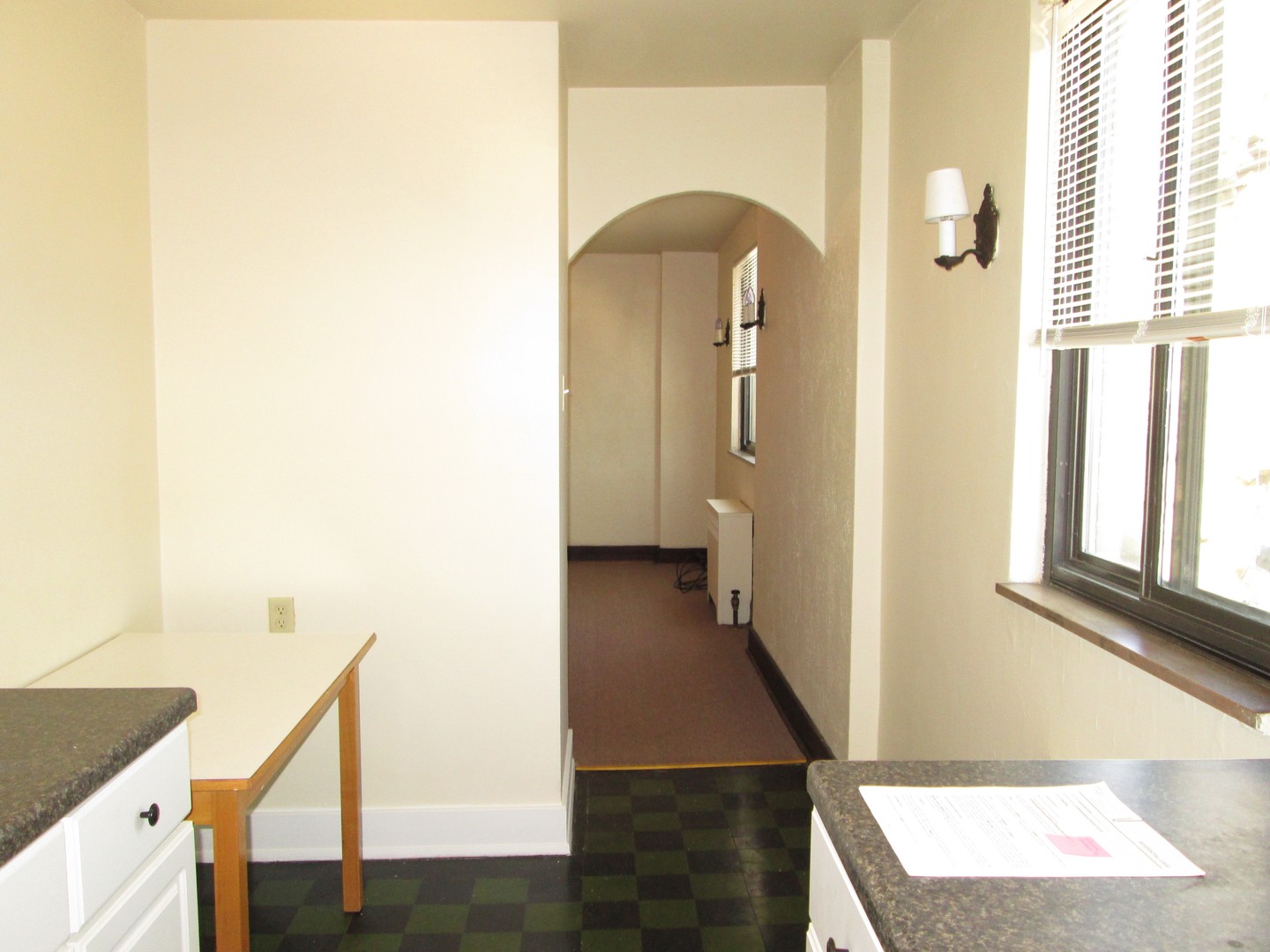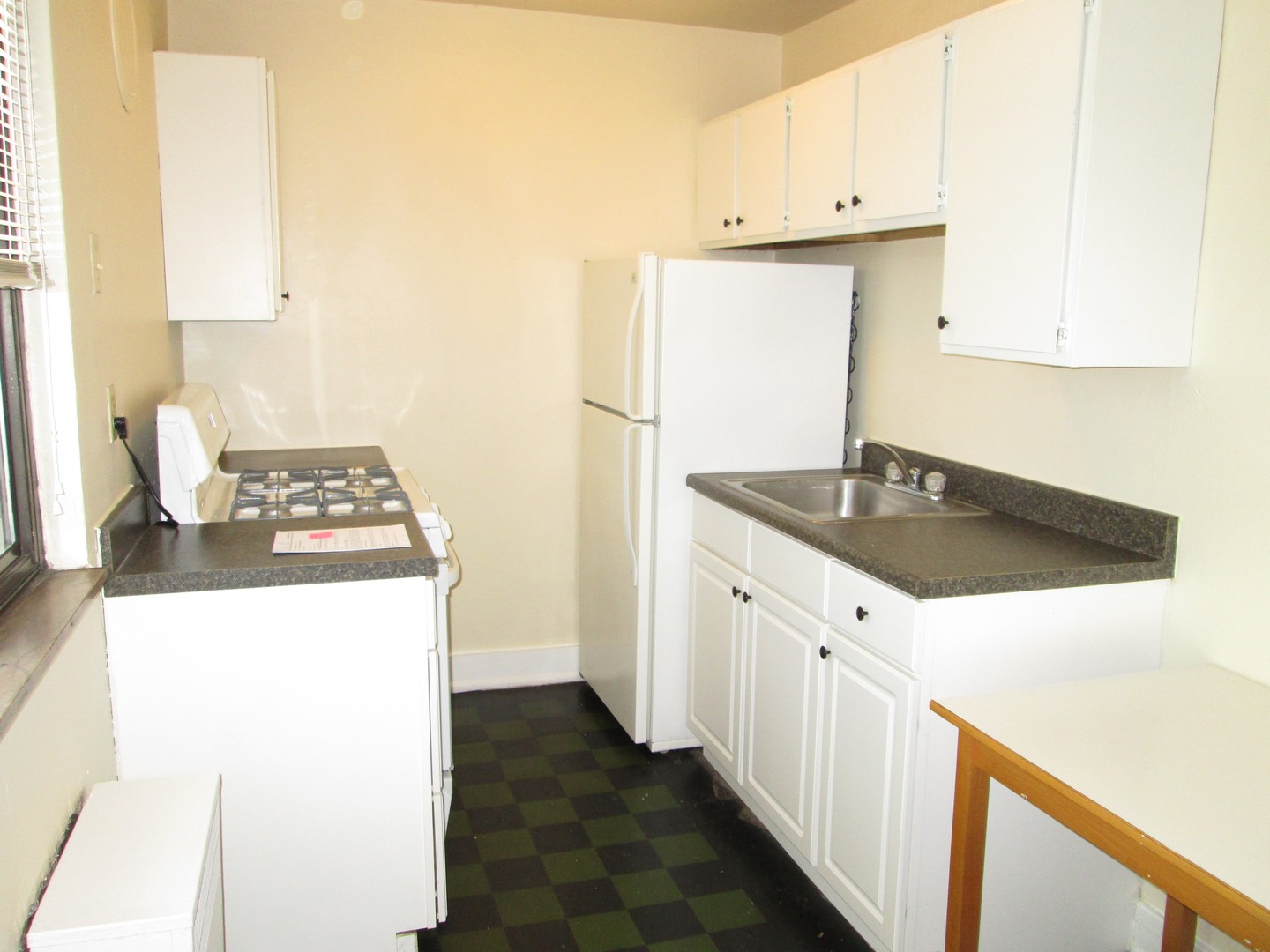 - Galley Kitchen with white Cabinets, black Countertops. Plenty of cabinet space!