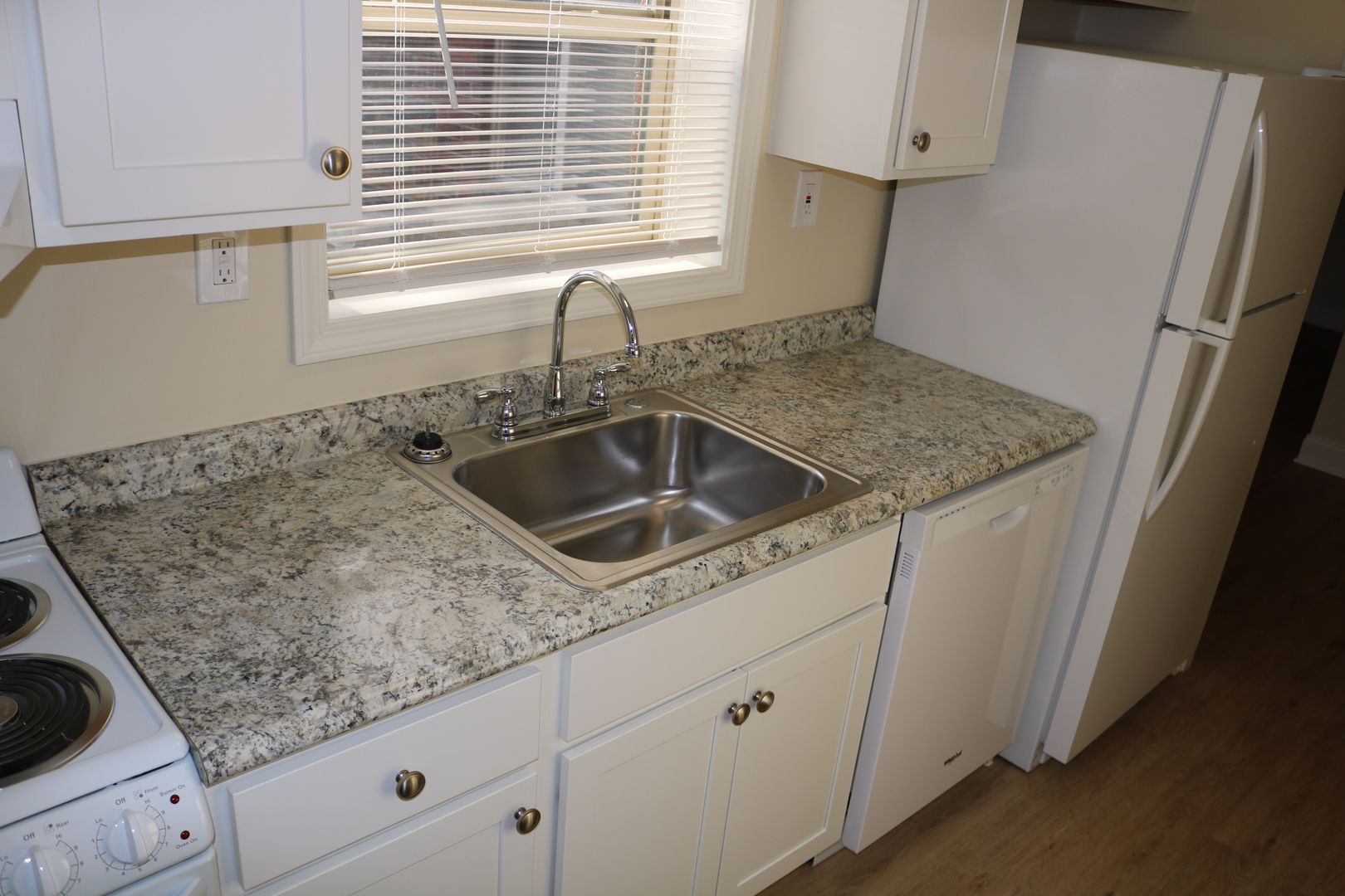 * Bright kitchen: white cabinets, Formica countertop, Laminate flooring.