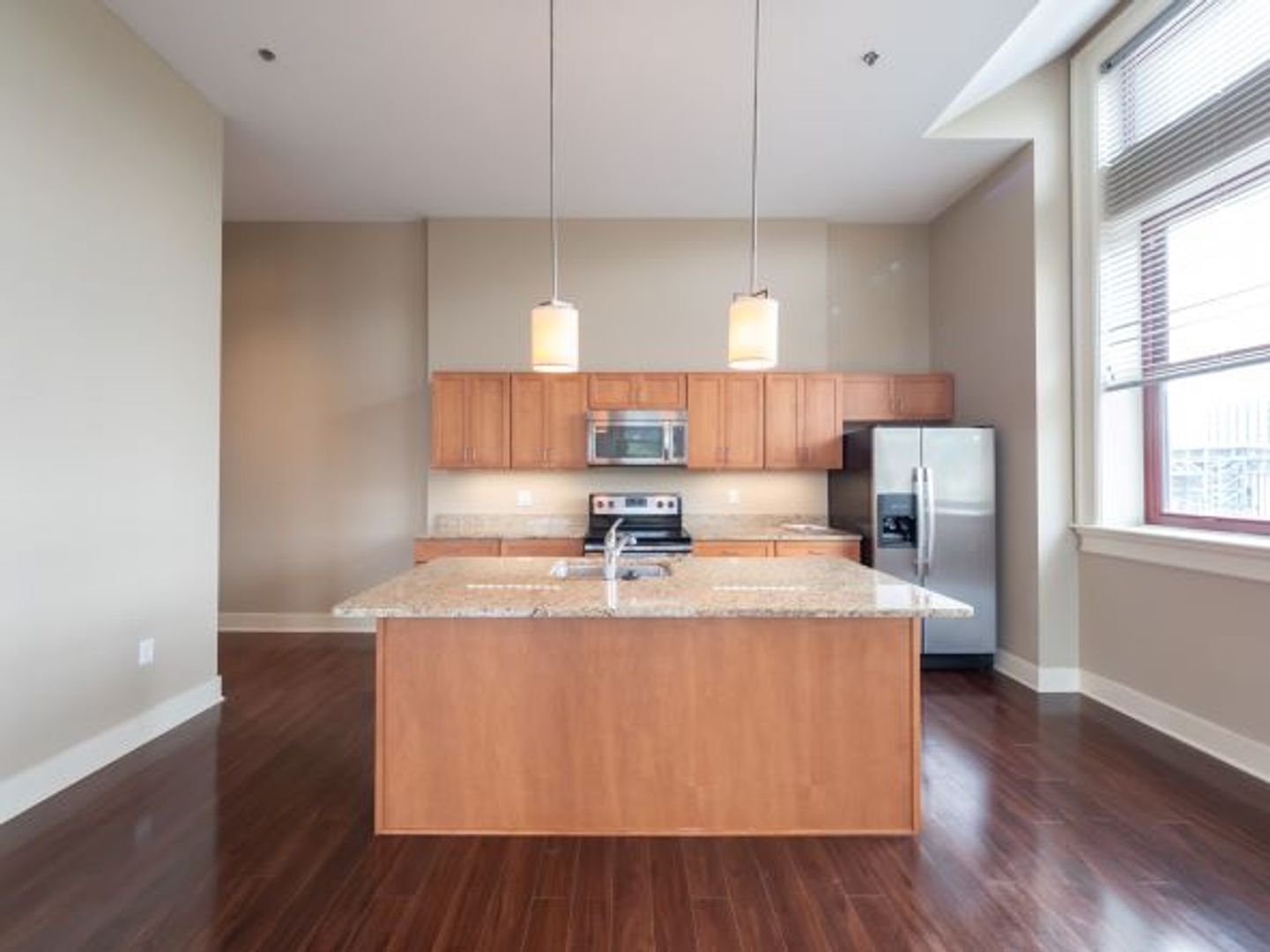 Inside, the apartment features an open-concept layout with expansive living space and two full walls of windows that bring in abundant natural light and offer impressive views toward Downtown. The modern kitchen includes granite countertops, maple cabinetry, stainless steel appliances, a dishwasher, and built-in microwave. Rich laminate flooring, exposed steel beams, designer lighting, and custom window treatments create a clean loft aesthetic that balances historic character with updated finishes.