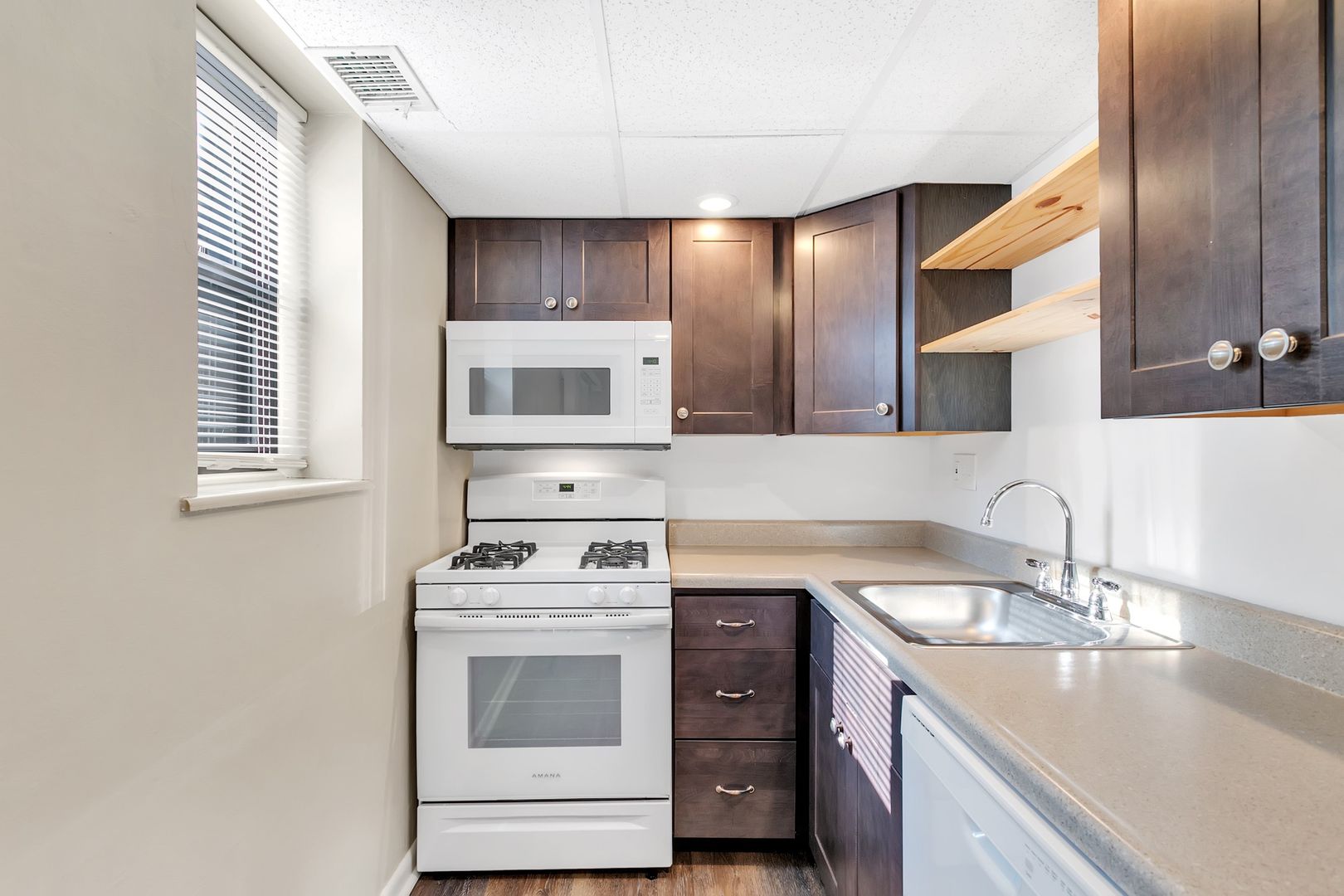 • L-shaped kitchen. Fully updated with nice white appliances and cabinets, including dishwasher and microwave!