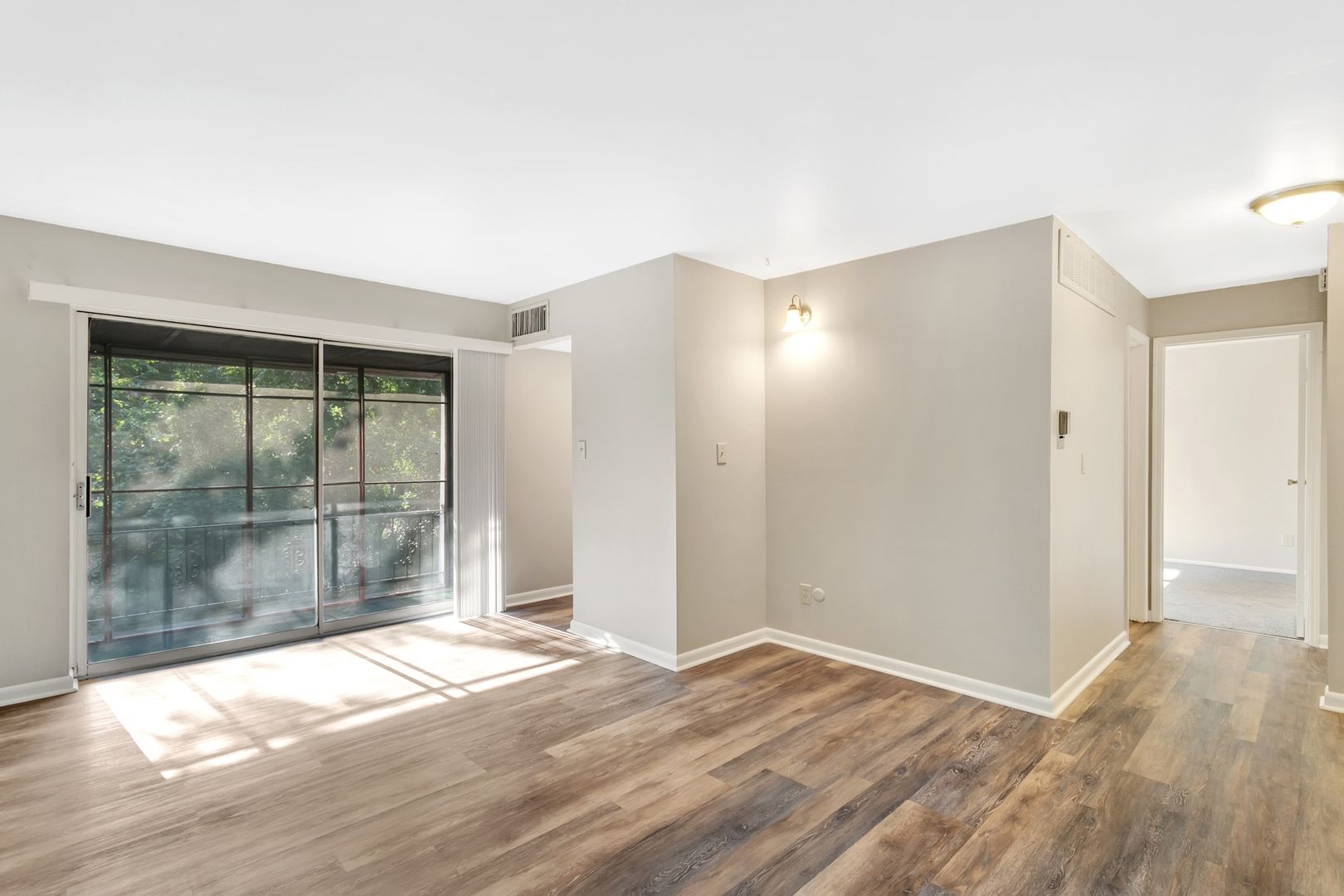 • Stunning laminate flooring in the living space. Wall-to-wall carpeting in the bedroom.