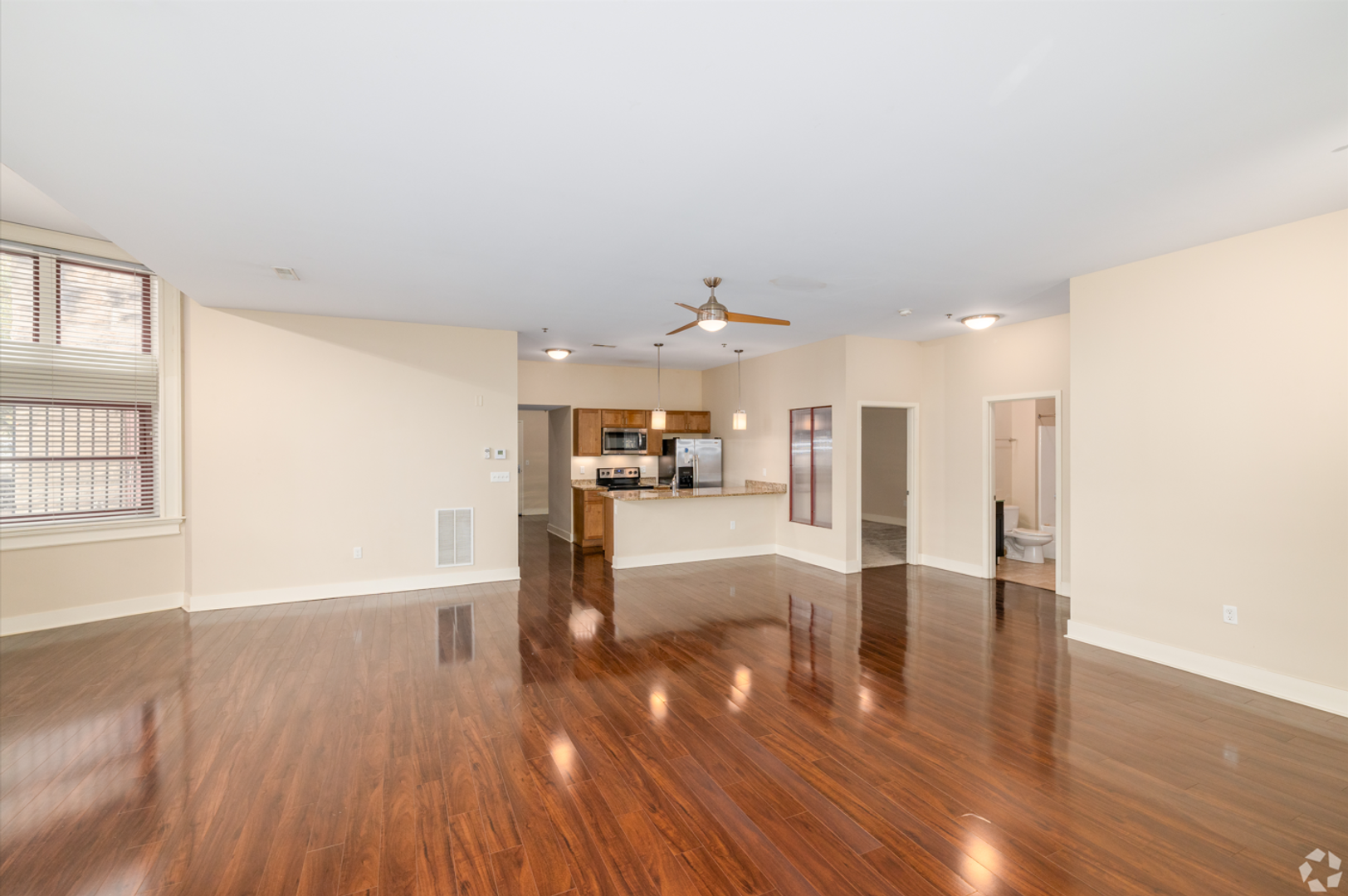 - Large windows let in lots of light! Designer window treatments and lighting give the unit a unique modern feel.