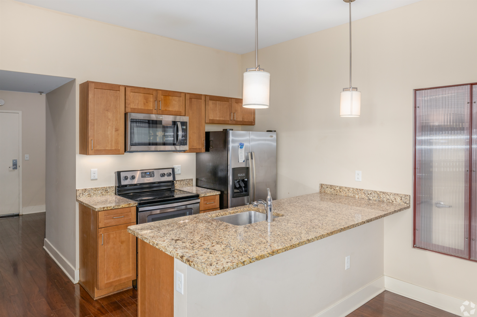 - Modern Kitchen with Granite Countertops and Stainless Steel Appliances, including a Microwave and Dishwasher.