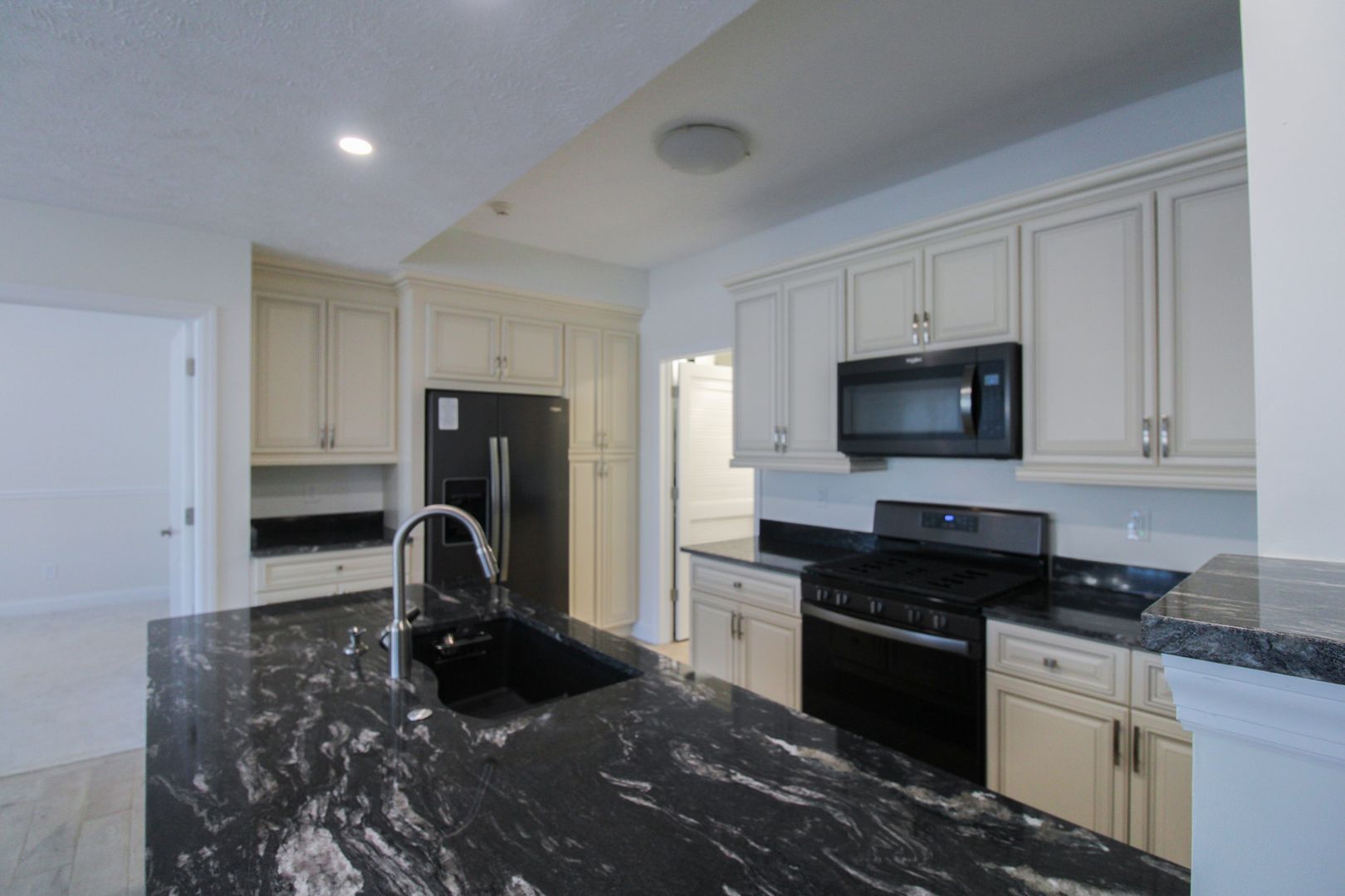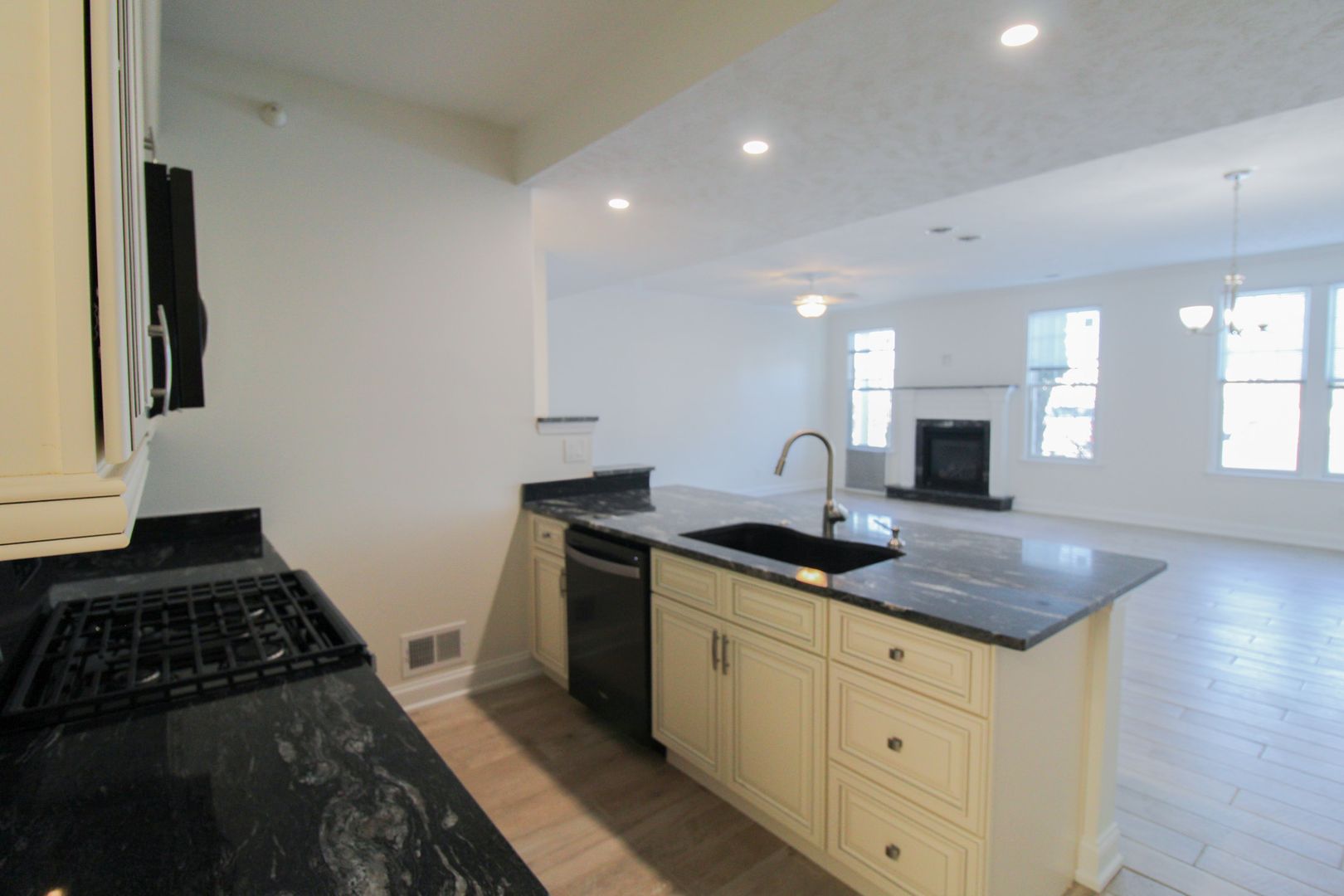 -Modern kitchen with granite countertops, dishwasher, and built-in microwave.