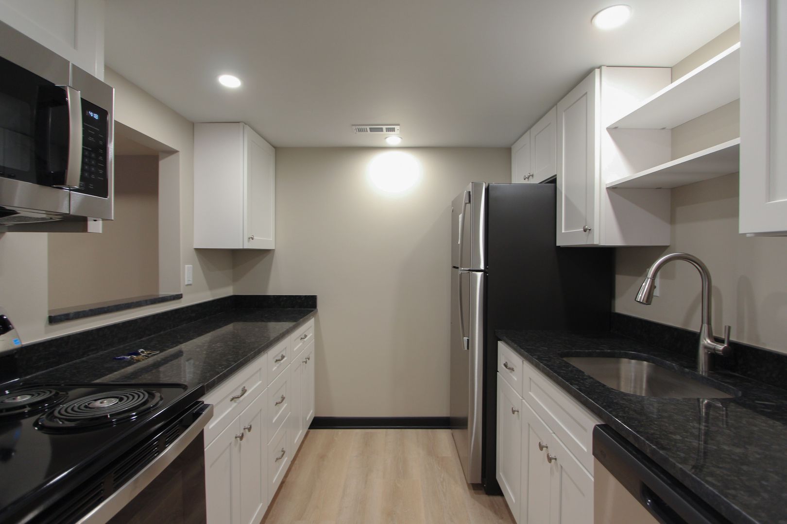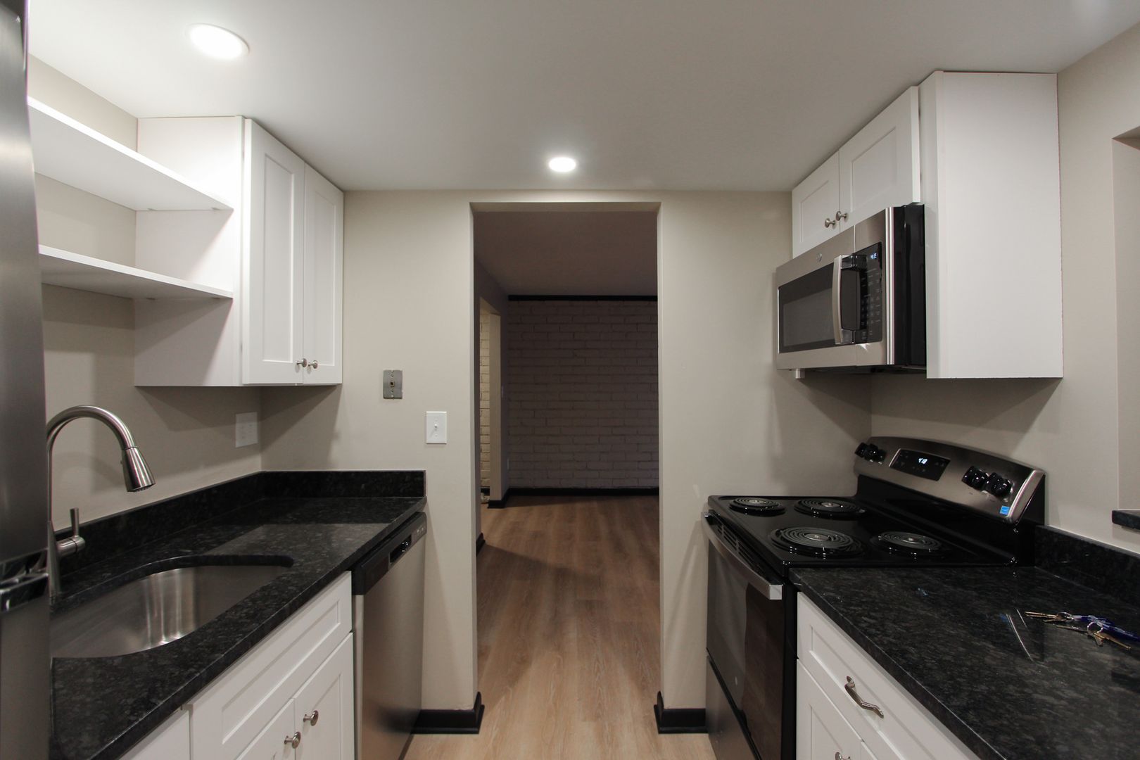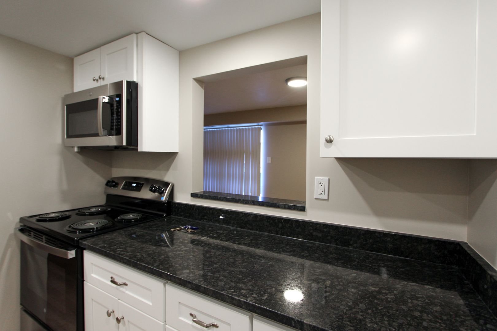 - Kitchen features updated white cabinets, new countertops, and stainless-steel appliances including dishwasher, stove, and built-in microwave. Pass-thru to Dining Room.