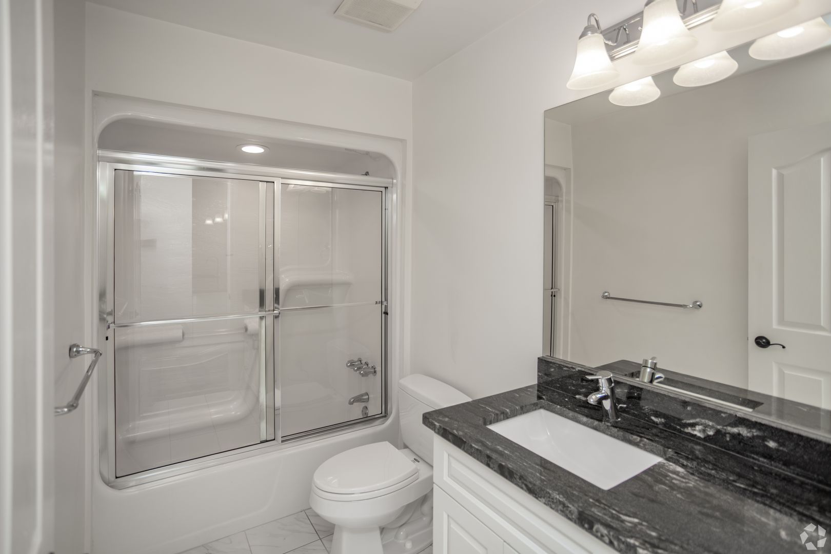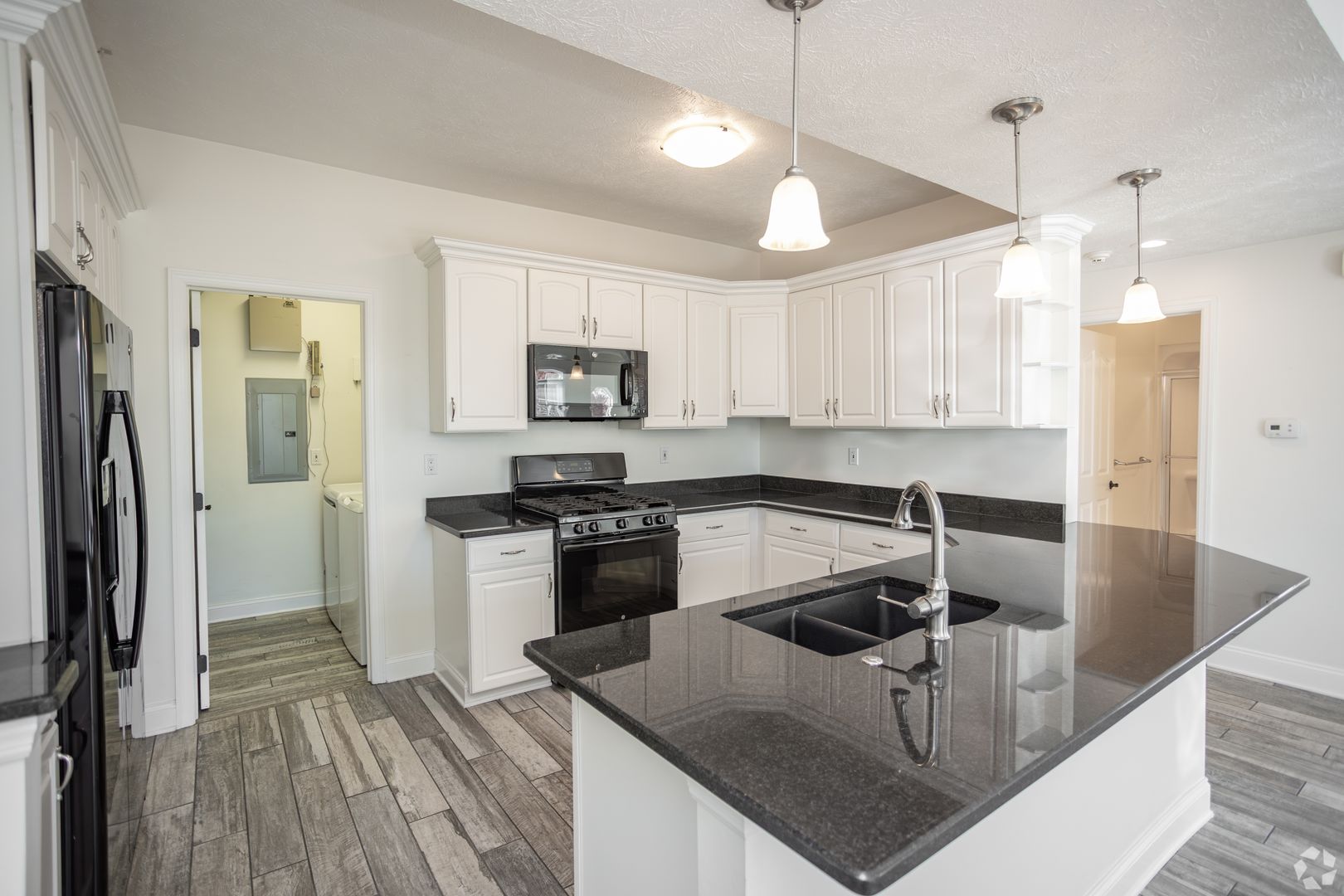 -Modern kitchen with granite countertops, dishwasher, and built-in microwave.