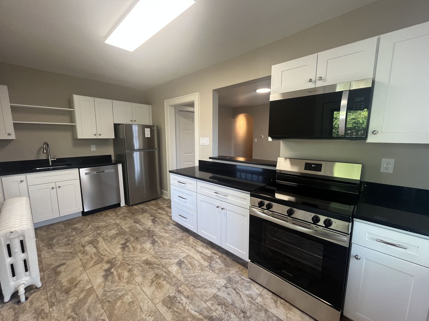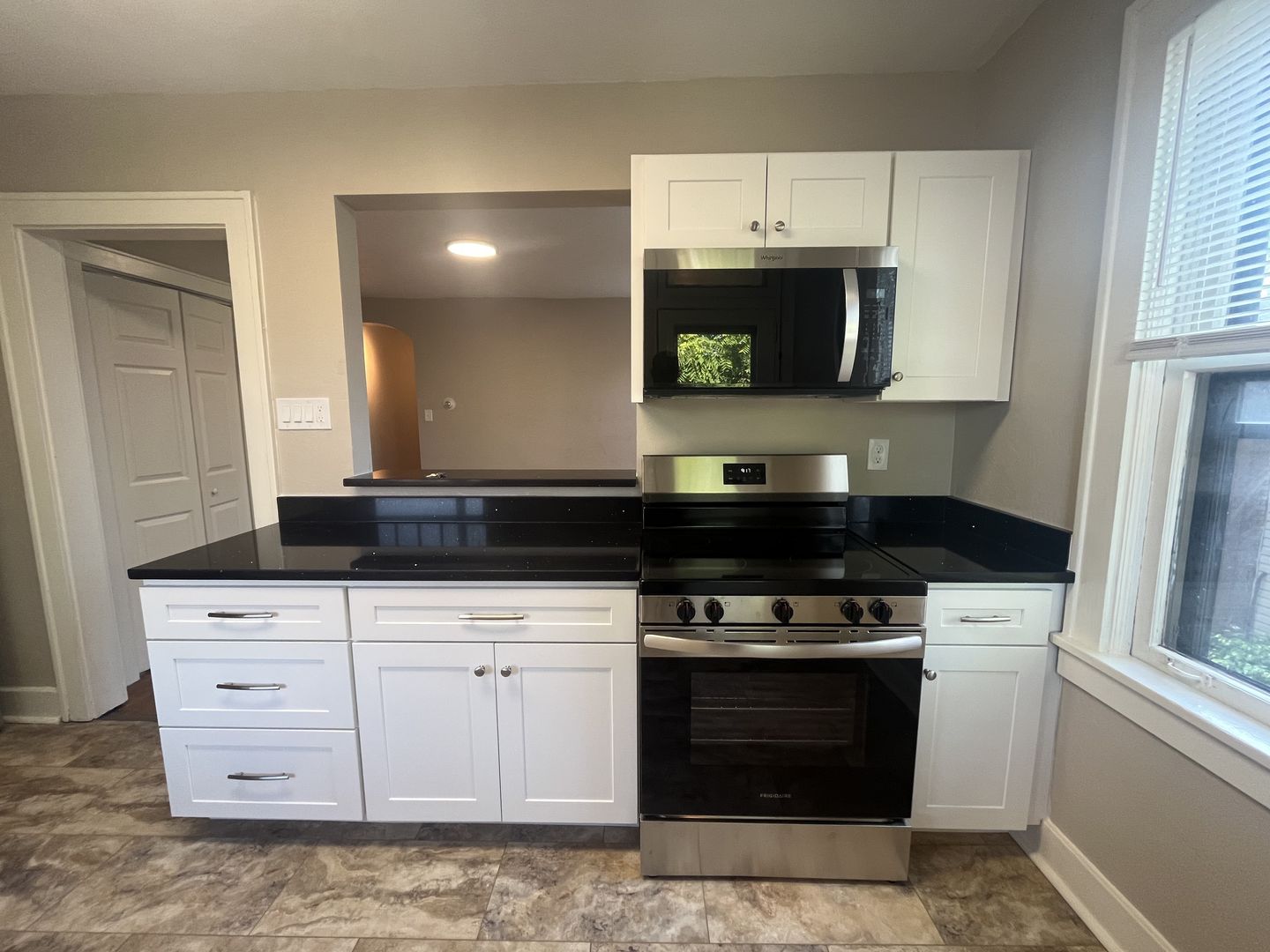 The newly renovated kitchen features a pass-through layout with white cabinetry, black countertops, stainless steel appliances, a dishwasher, microwave, and luxury vinyl flooring.