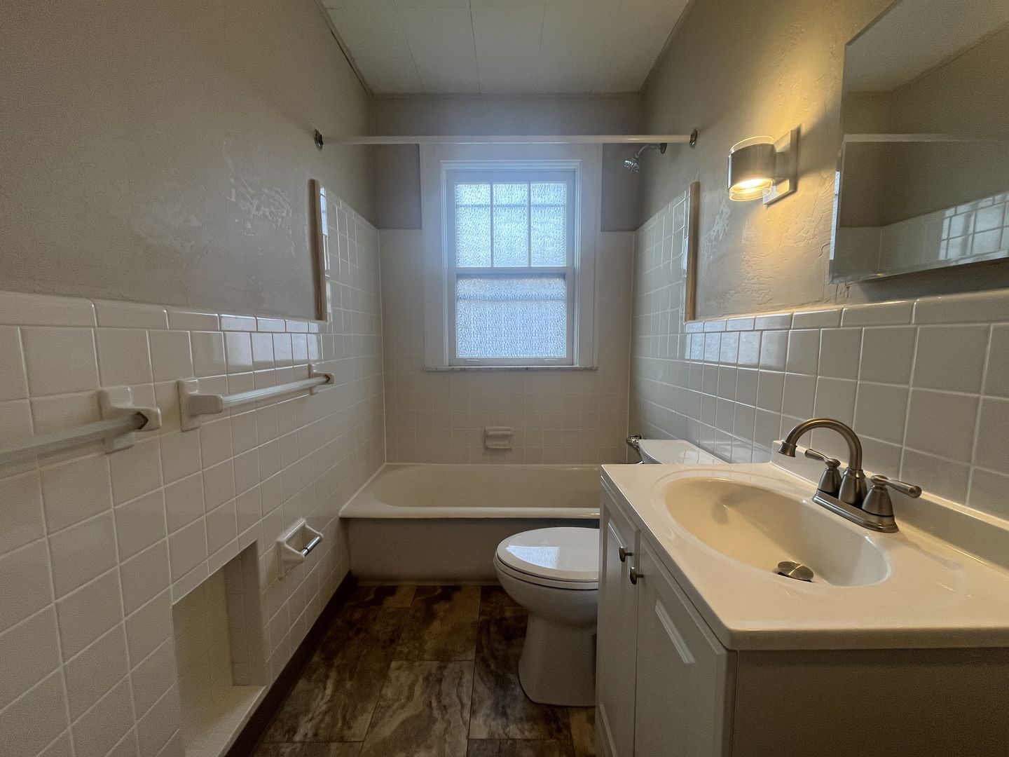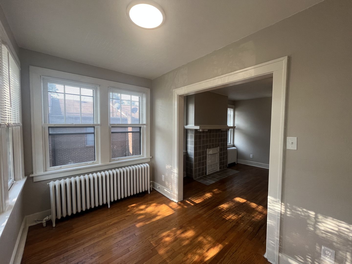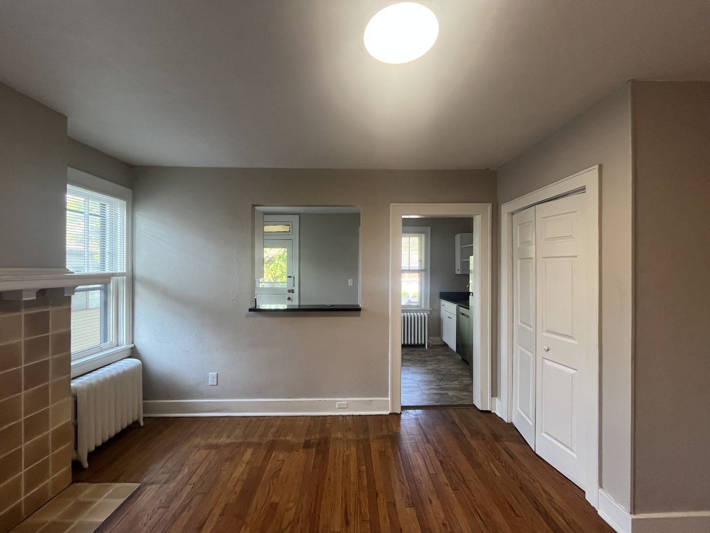 This updated unit blends classic character with fresh modern finishes. The living room features hardwood flooring and a decorative fireplace, while the bedroom includes new wall-to-wall carpeting for added comfort.