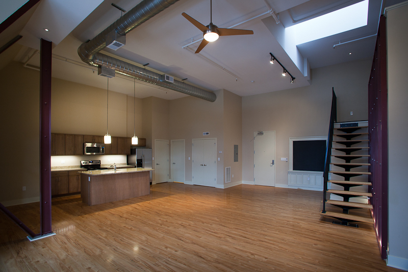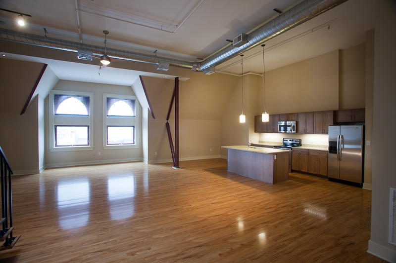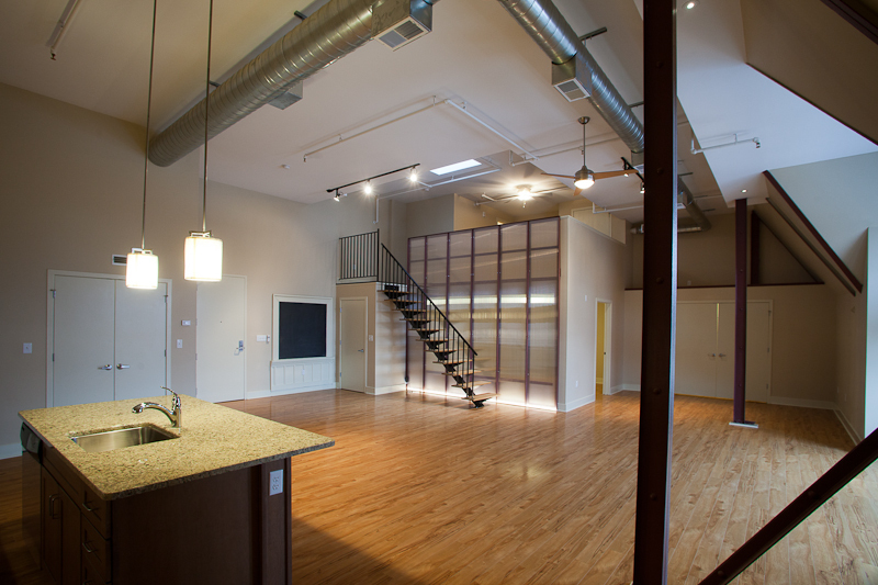Inside, the apartment features a dramatic multi-level layout with an open living, dining, and kitchen space designed for both comfort and entertaining. The kitchen includes granite countertops, maple cabinetry, stainless steel appliances, a dishwasher, built-in microwave, and a large island that functions as both workspace and seating area. A raised dining area offers elevated views toward Downtown, while large windows throughout the unit bring in strong natural light. Rich laminate flooring, exposed steel beams, and designer lighting complete the loft-style aesthetic.