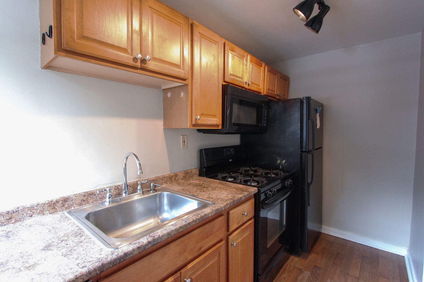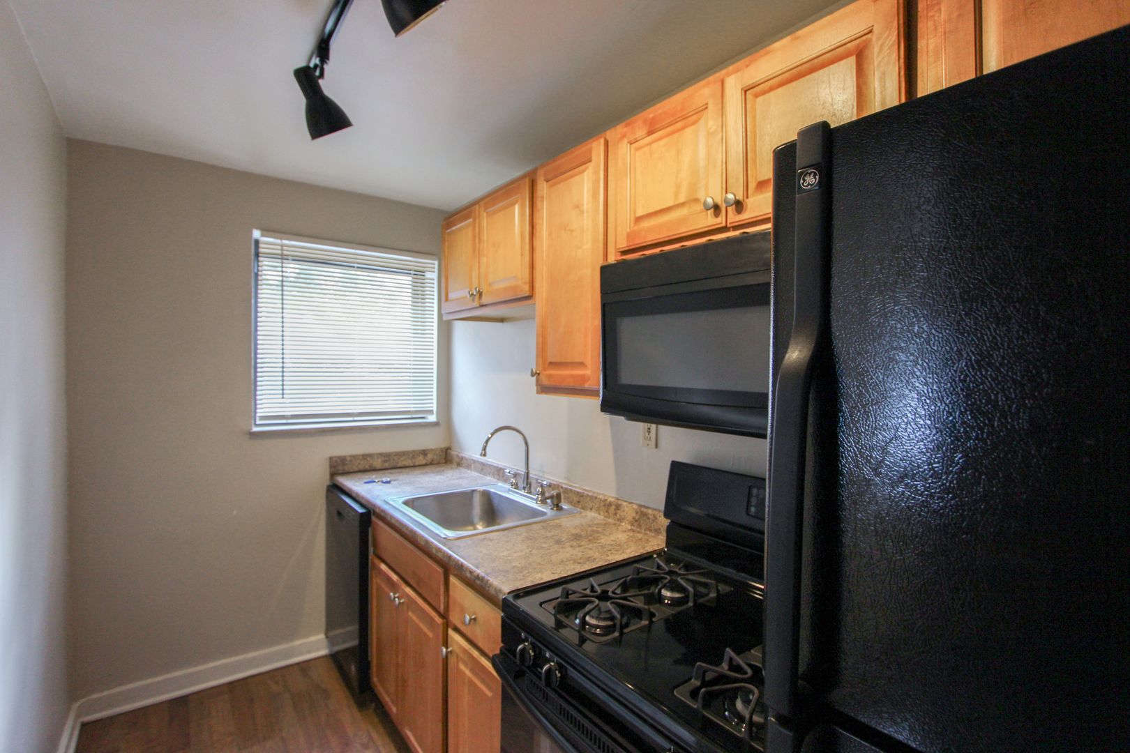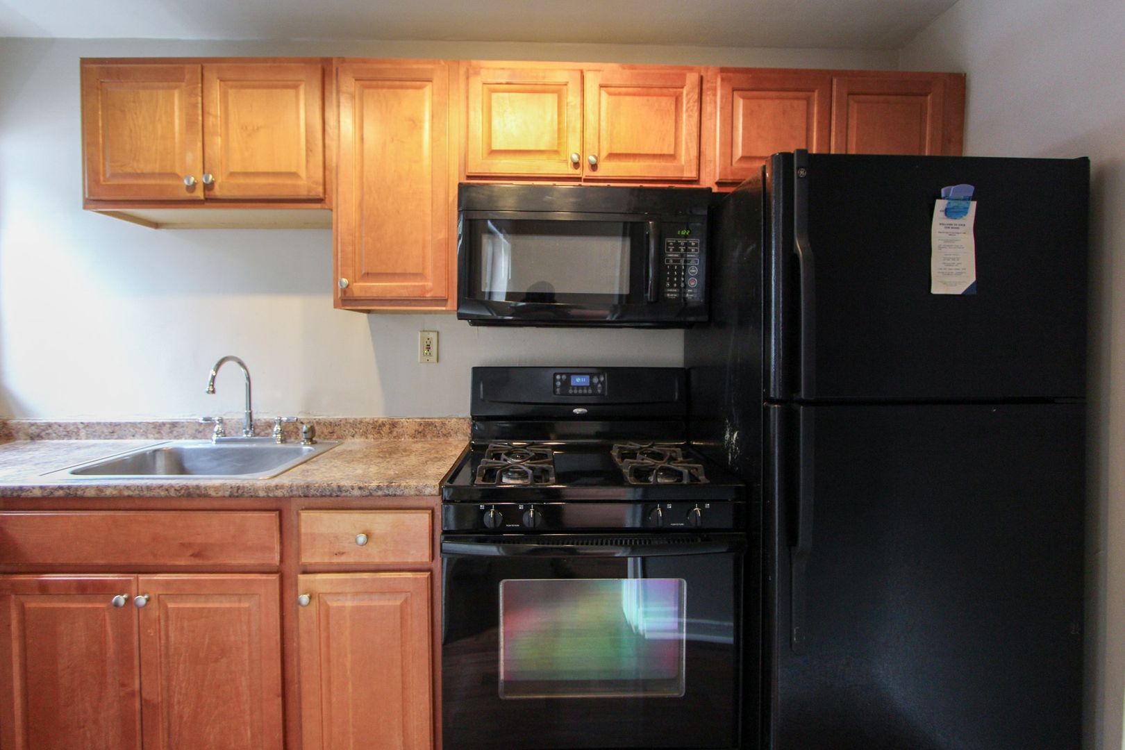 The updated kitchen features maple cabinetry, black appliances, a dishwasher, and a built-in microwave.