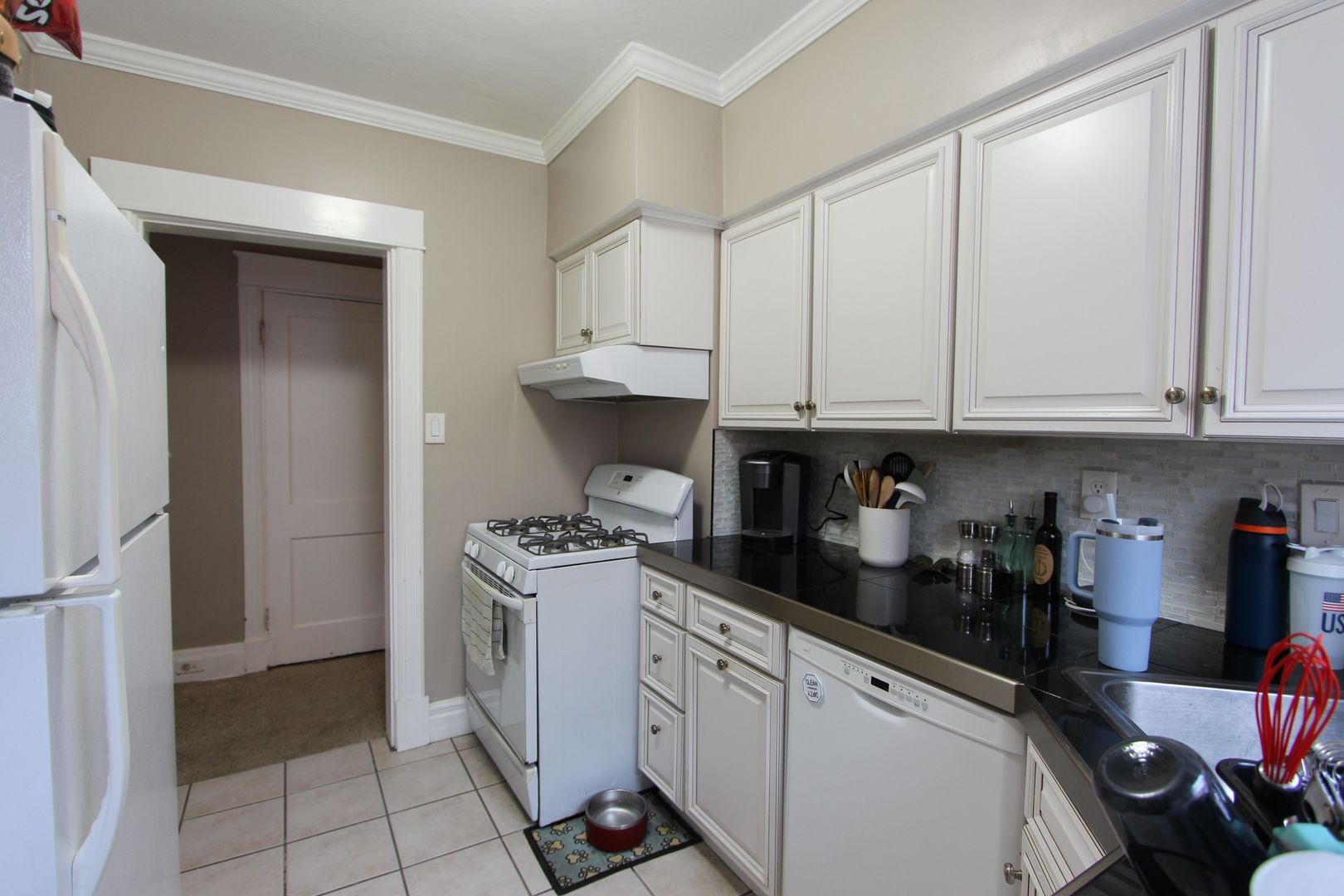 Inside, the approximately 1,200-square-foot apartment offers generous room sizes and a classic layout with hardwood flooring through the living room, dining room, and sunroom. Both bedrooms feature wall-to-wall carpeting for added comfort, while the updated kitchen includes white cabinetry, white appliances, a stove/oven, refrigerator, and dishwasher. The sunroom adds flexible extra living space, and the in-unit washer and dryer provide everyday convenience.