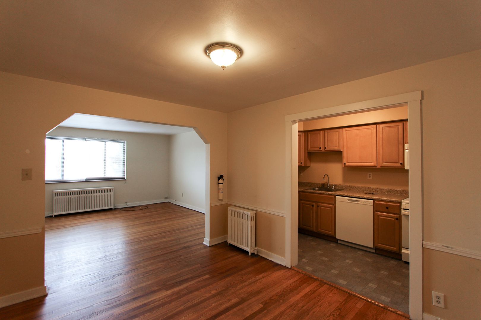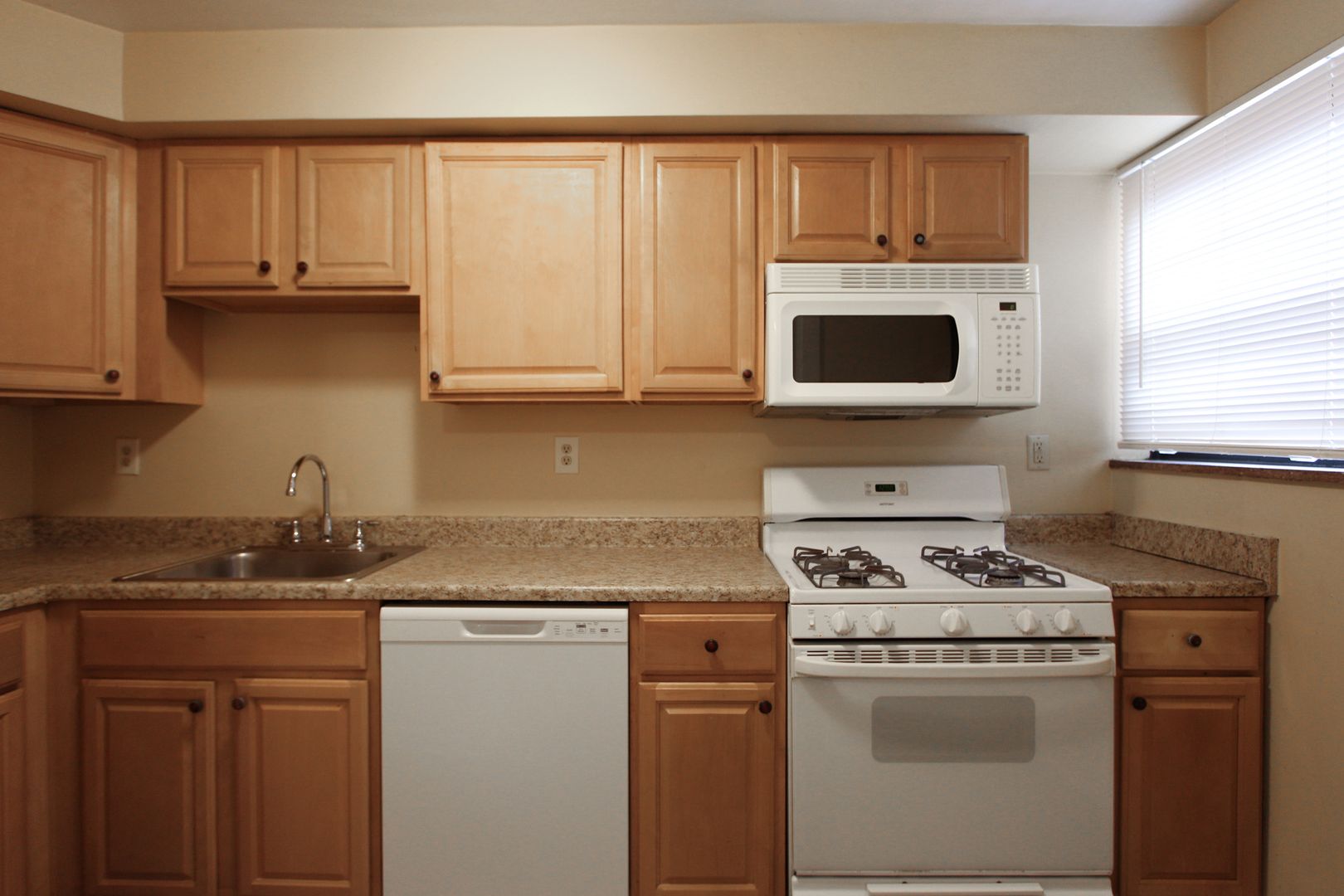 The updated kitchen includes maple cabinetry, Formica countertops, a dishwasher, built-in microwave, and white appliances.